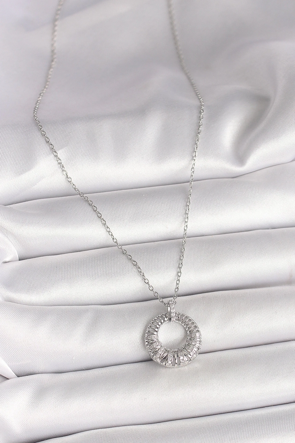 316L Çelik Gümüş Renk Zincir Zirkon Taş İşlemeli Daire Model Kadın Kolye