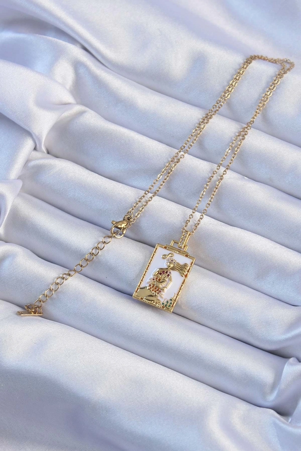 316L Çelik Zincir Altın Renk Beyaz Mineli Tarot Kolye