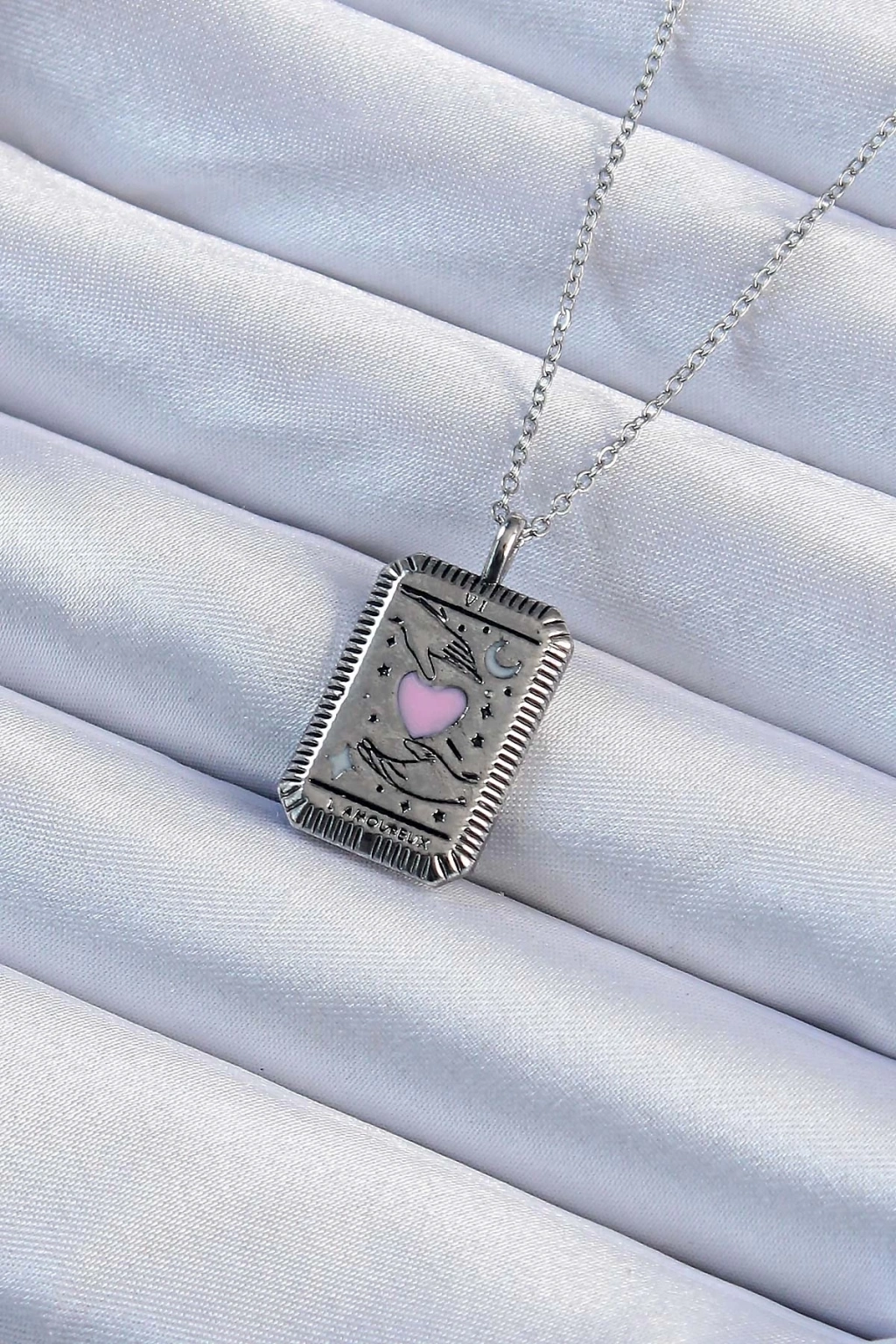 316L Çelik Zincir Eskitme Gümüş Renk Pembe Mineli Kalp Figürlü Tarot Kolye