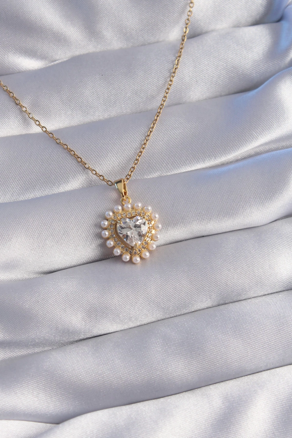 316L Çelik Zincir Gold Renk İncili Zirkon Taşlı Kalp Tasarımlı Kolye