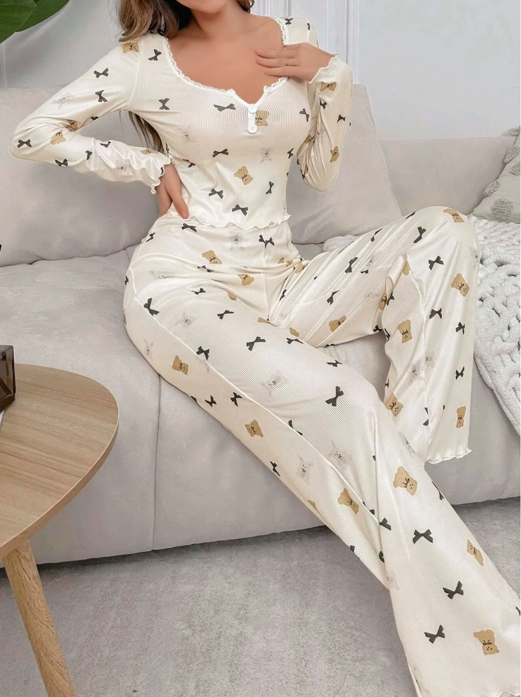 Kadın Ekru Ayıcık ve Fiyonk Desenli Yumuşak Pamuklu Uzun Pijama Takımı 5129