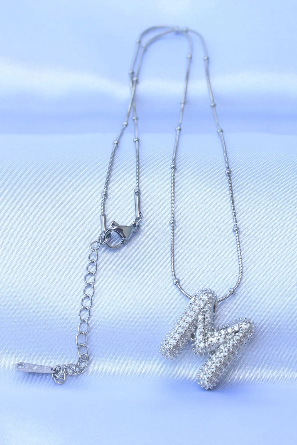 316L Çelik Zincirli Zirkon Taşlı M Harfli Gümüş Renk Bubble Kolye