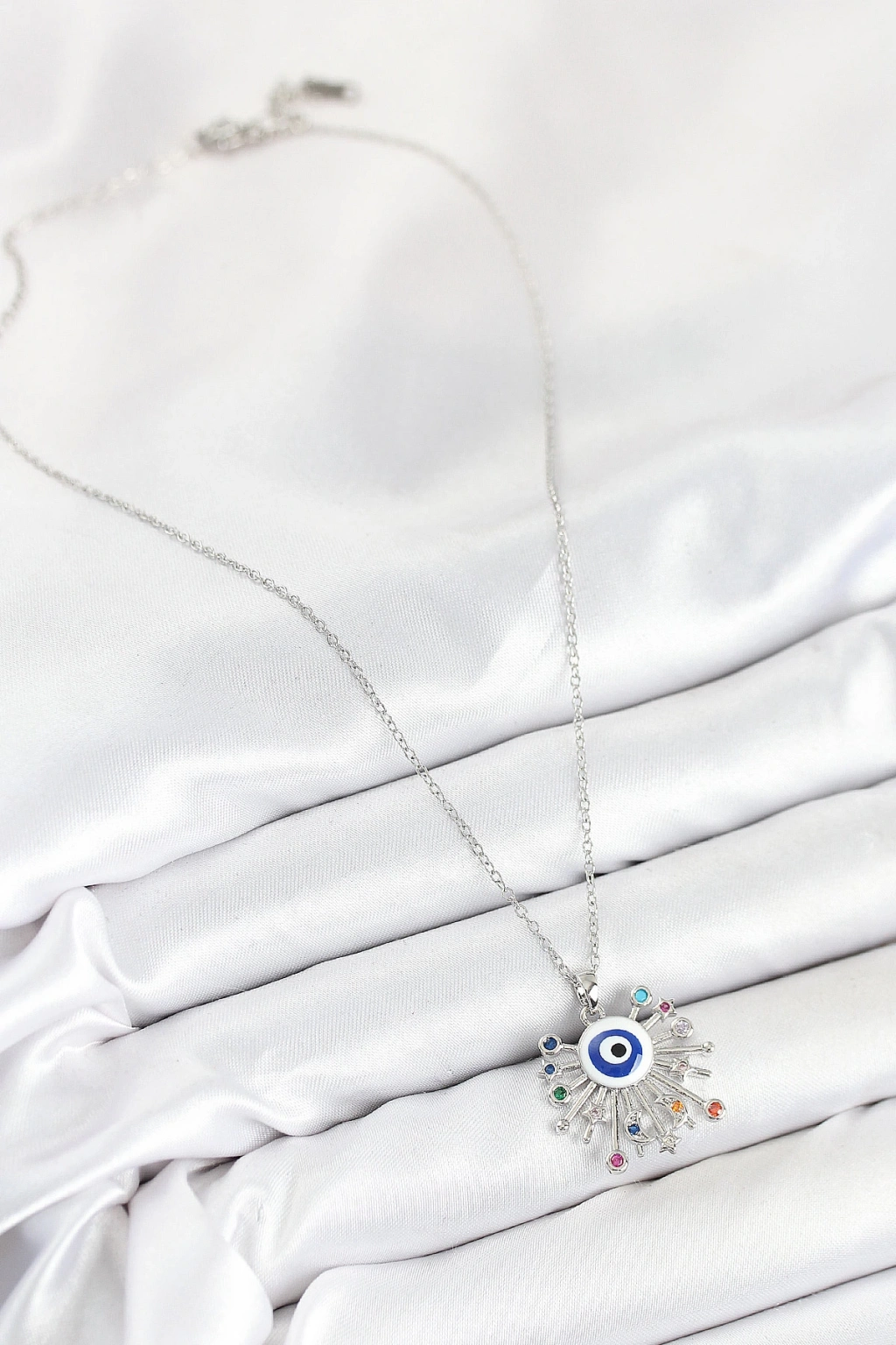 316L Çelik Zirkon Taşlı Nazar Model Gümüş Renk Kadın Kolye