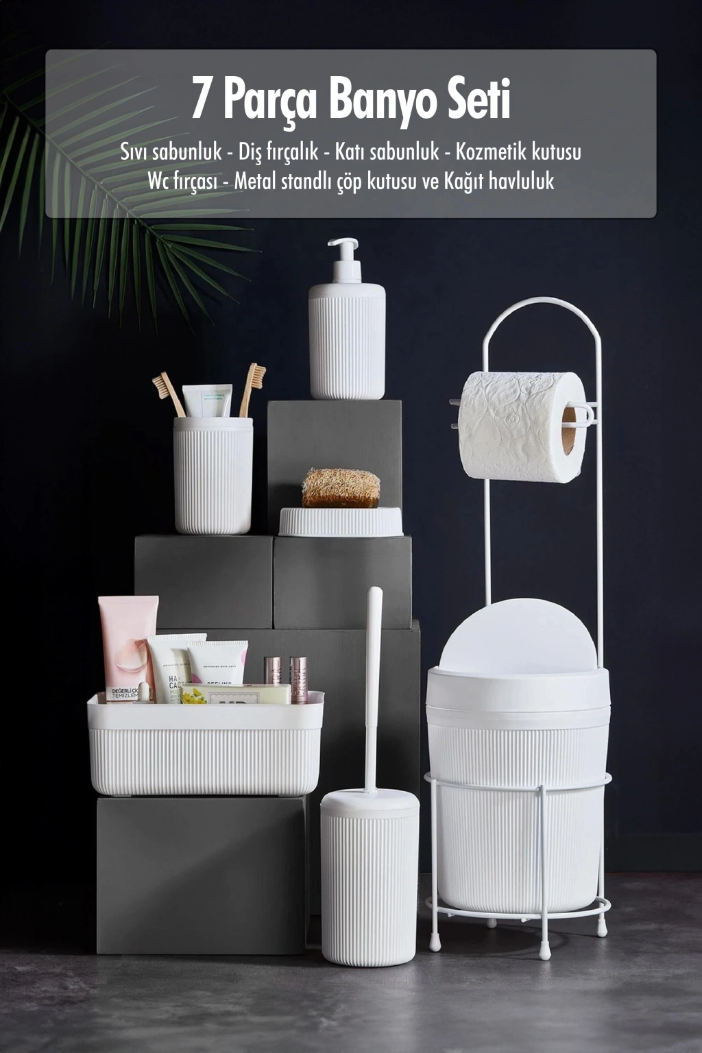 7 Parça Beyaz Banyo Seti Metal Stantlı Kovalı Wc Kağıtlık Kozmetik Kutusu Diş Fırçalık Ve Sabunlukla