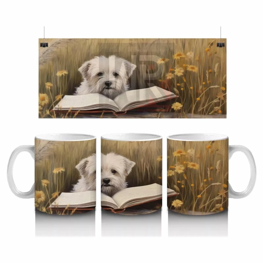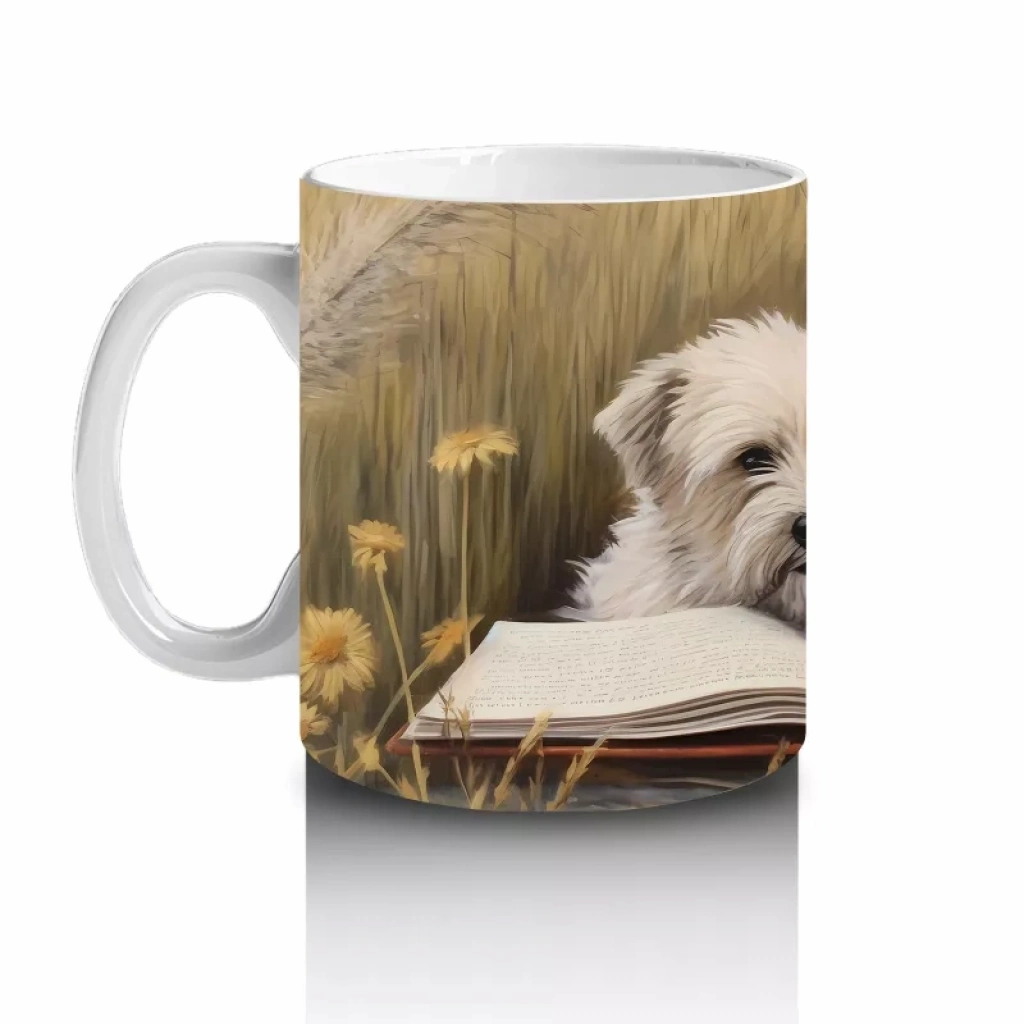 Açık Kitap Üzerinde Oturan Gözlüklü Yavru Köpek – Baskılı Kahve Kupası