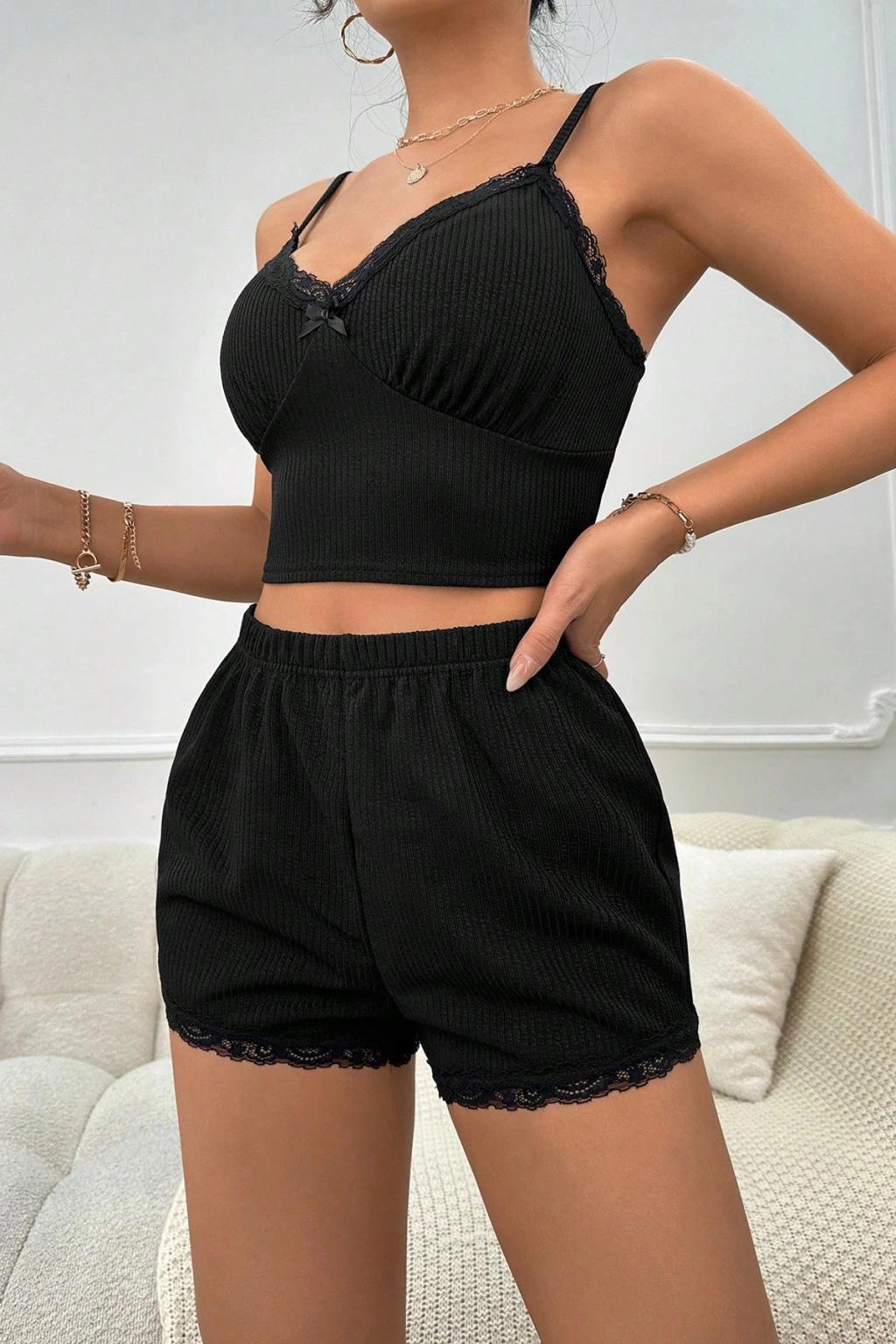 Kadın Siyah Alt ve Üst Dantel Detaylı Fiyonklu Şortlu Gecelik Takımı