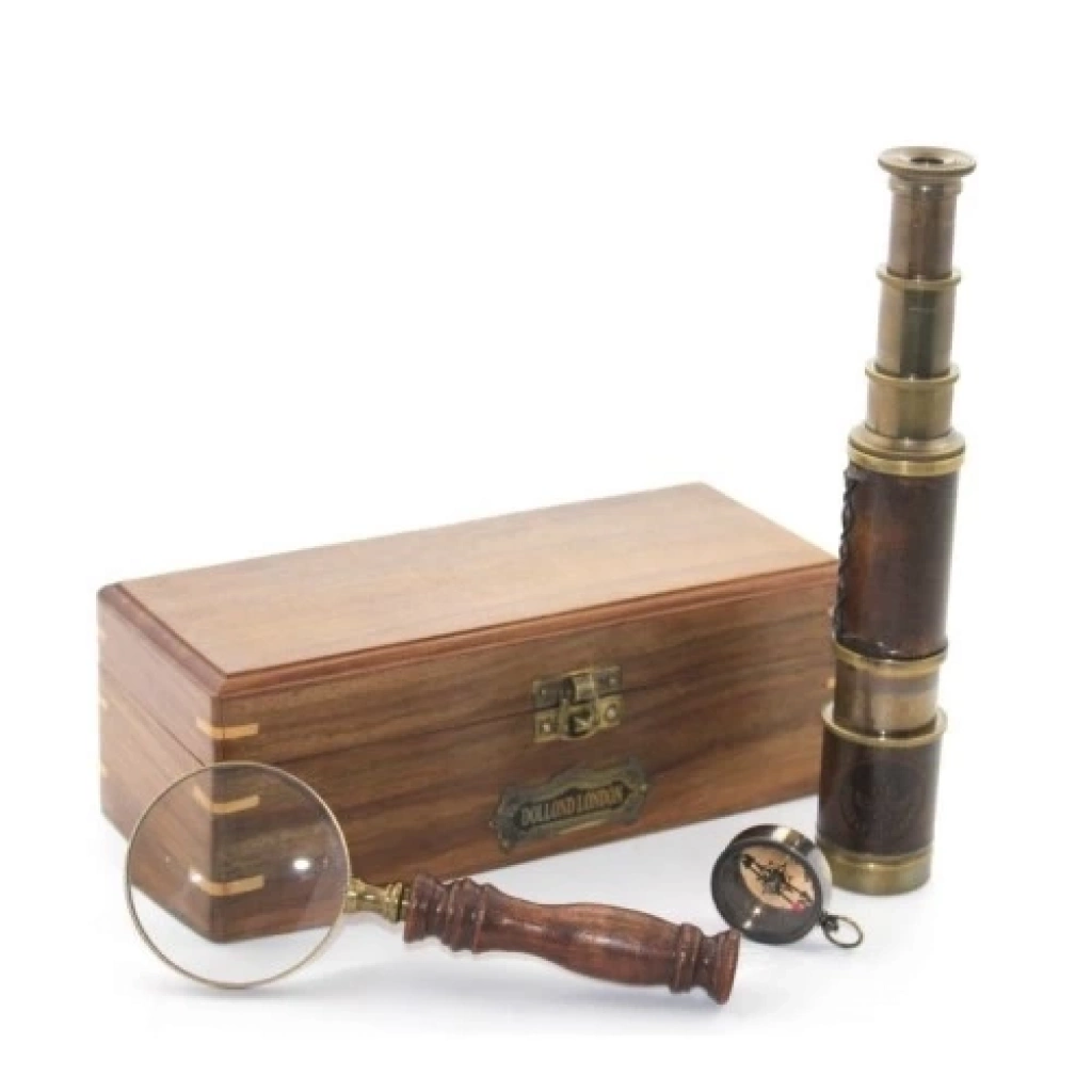 Ahşap Kutu Pirinç Pusula, Dürbün, Büyüteç, Seti Model 2