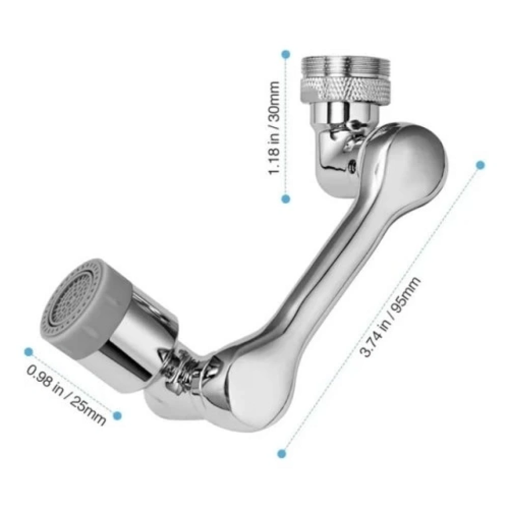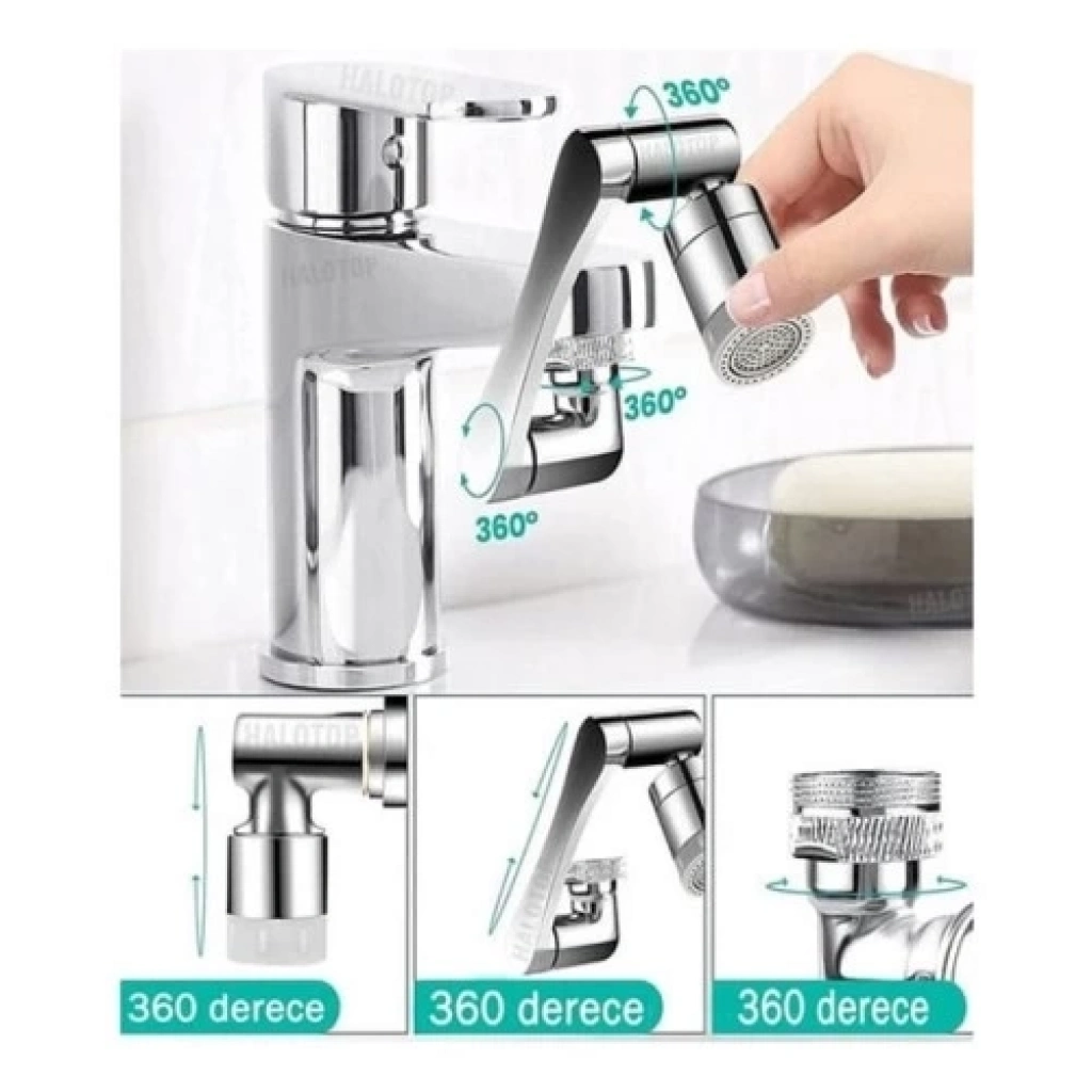 AKROBAT MUSLUK BAŞLIĞIHer Köşeye Ulaşan Temizlik, 1080° Çok Yönlü Döndürme ile1080° çok yönlü döndürme robotik kol tasarımı, su akışının lavabonun her köşesine ulaşmasını sağlayan toplam üç adet 360° dönüş arayüzüne sahiptir. Musluk havalandırıcı, iki su çıkış modu arasında geçiş yapabilme özelliği ile sıçramadan yumuşak kabarcık akışı elleri yıkamak için idealdir ve basınçlı sprey ise bardakları durulamak için uygundur.Bu ürün, metal görünümlü yüksek kaliteli ABS plastikten üretilmiştir ve aletsiz kurulum imkanı sunar; elle kolayca monte edilebilir. Çoğu ev musluğuyla uyumlu olan bu musluk ucu, 20/22/24 mm olmak üzere üç farklı diş seçeneği içerir. Çok amaçlı tasarımı sayesinde, mutfakta çeşitli meyveleri ve bulaşıkları yıkamak, banyoda yüzünüzü veya saçınızı yıkamak ve lavaboyu temizlemek için uygundur.Çift fonksiyonlu su akışı tasarımı, inatçı kirlerden kurtulmayı ve suyun lavabonuzun her köşesine ulaşmasını sağlar, mutfaktaki tüm ihtiyaçlarınızı karşılar. Mutfakta sebze ve meyveleri durulamak için, yemekleri yıkamak ve lavaboyu temizlemek için kullanılabilir. Banyoda ise günlük el ve yüz yıkamada büyük rahatlık sağlar ve pratik bir şekilde saçlarınızı yıkamanıza olanak tanır.Paket İçeriği:- 1080 Derece Dönebilir Musluk Ucu- Ürün, direkt olarak 22mm iç dişli bağlantı çapındadır. Paket içerisinden çıkan plastik manşon sayesinde 24mm dış dişli haline getirebilirsiniz.**Malzeme:** ABS Plastik**Ürün Rengi:** Gümüş, metal görünümlü plastikten üretilmiştir.