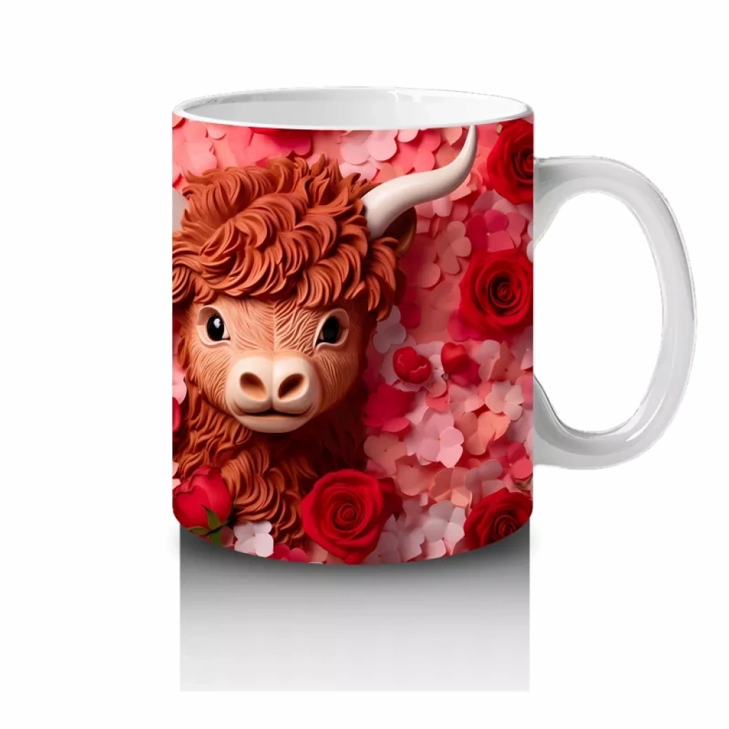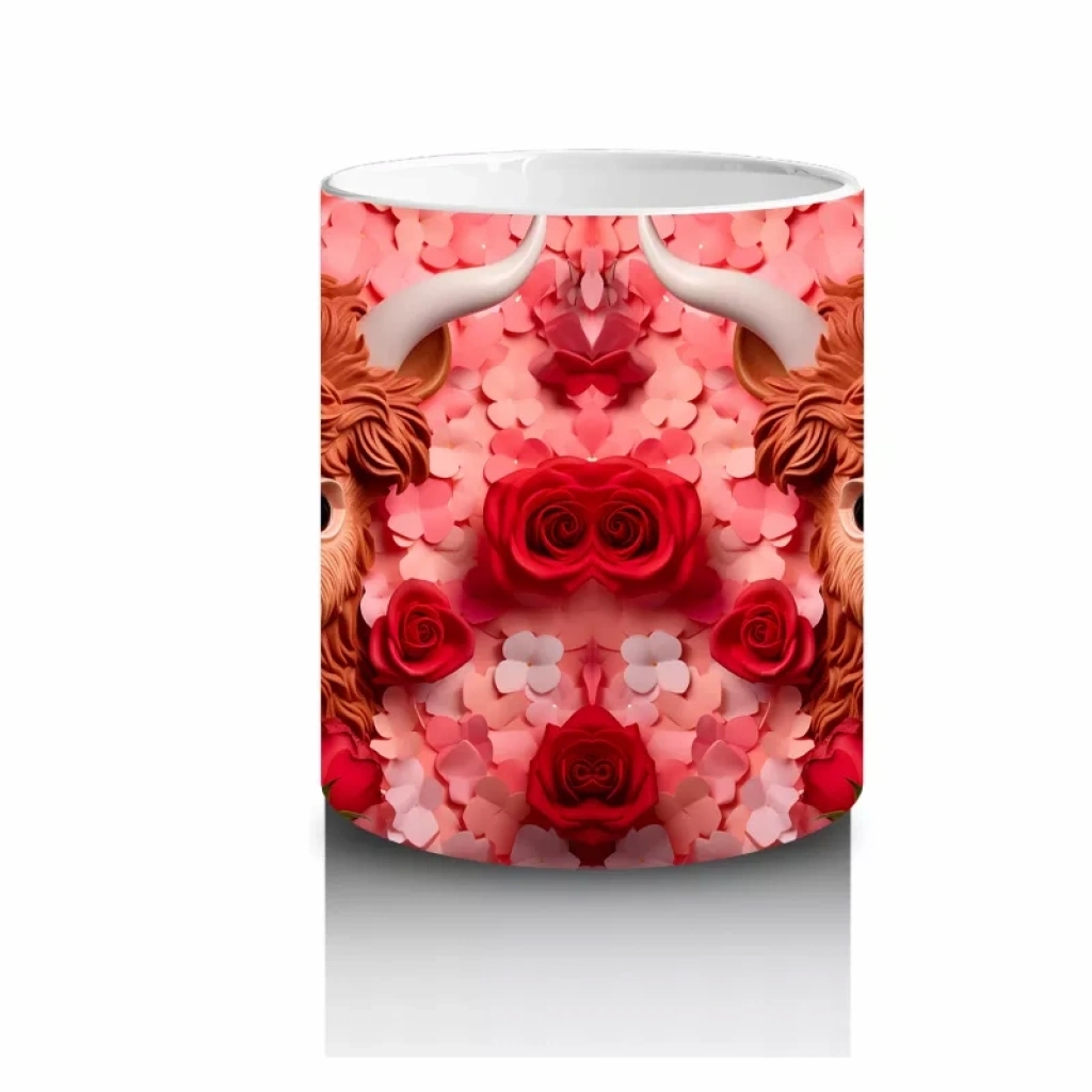 Sıcak alev tonlarıyla parlayan arka planda yer alan ikiz Highland buzağılar, hem asi hem sempatik bir etki bırakıyor. Farklı ve dikkat çekici bir hayvan temalı kupa arayanlara özel.