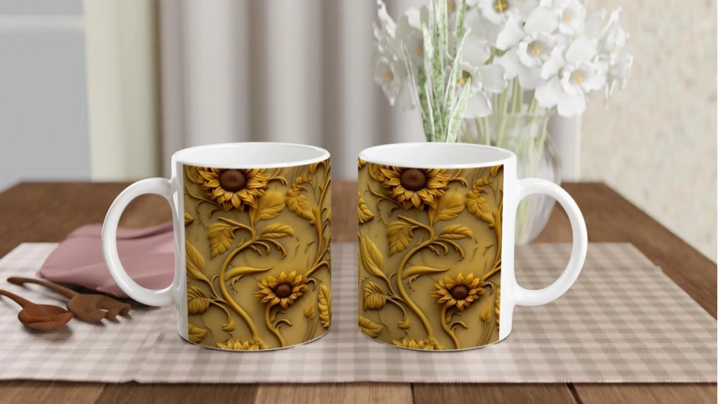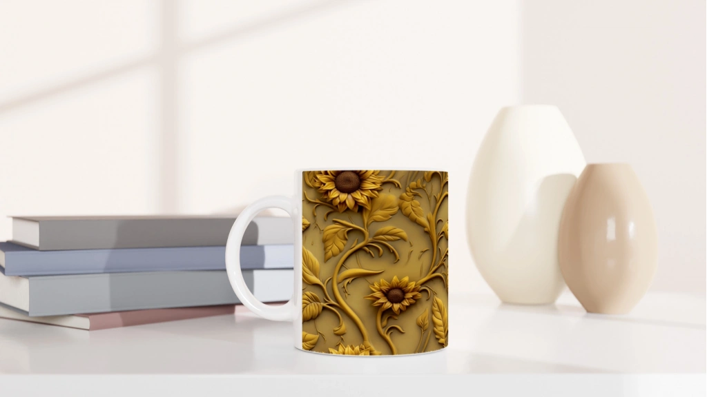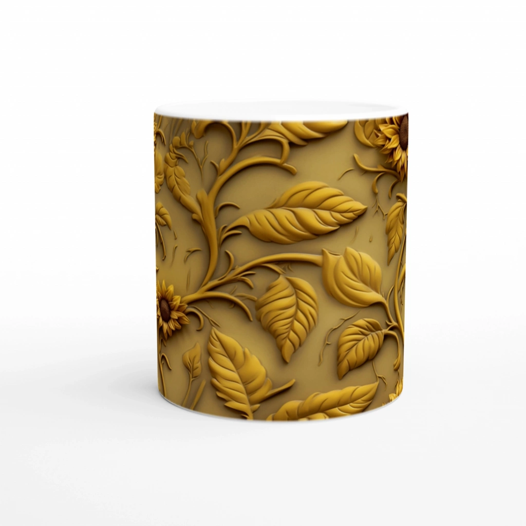 Zengin altın tonlarında, rölyef görünümlü ayçiçeği desenleriyle bezenmiş bu özel kupa bardak, klasik ve lüks tasarımlardan hoşlananlar için eşsiz bir tercih sunuyor.