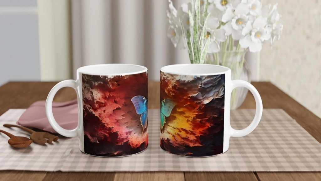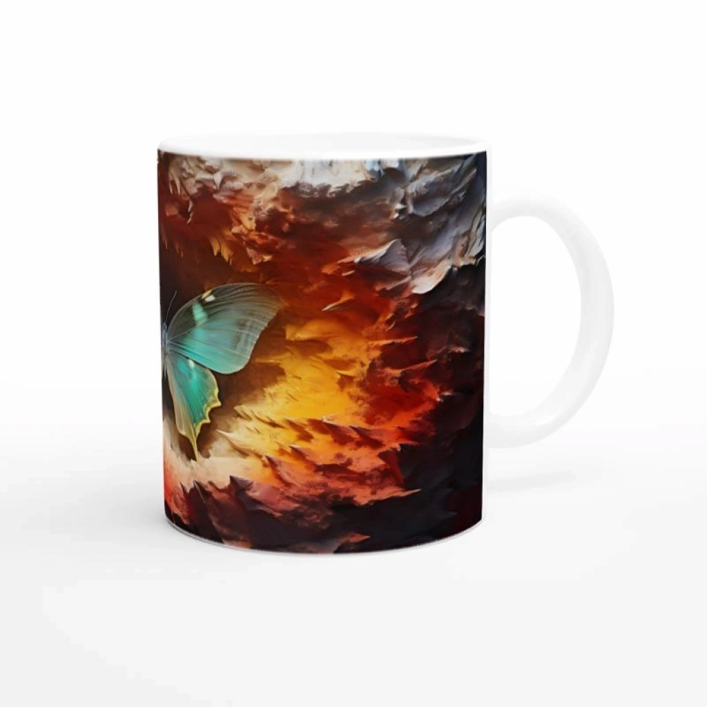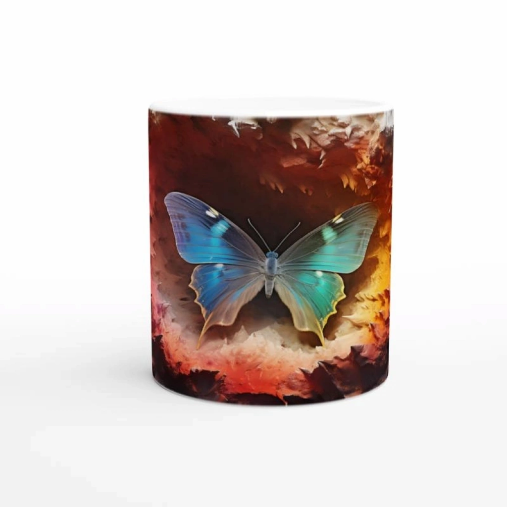 Ateş Çemberinden Doğan Mavi Kelebek Temalı Baskılı Kupa Bardak, alev kırmızısı ve gece tonlarının ortasında parlayan zarif bir kelebek figürüyle adeta yeniden doğuşu simgeliyor. Sanatı ve doğayı bir araya getiren bu özel tasarım, tutkulu ruhlara hitap ediyor.