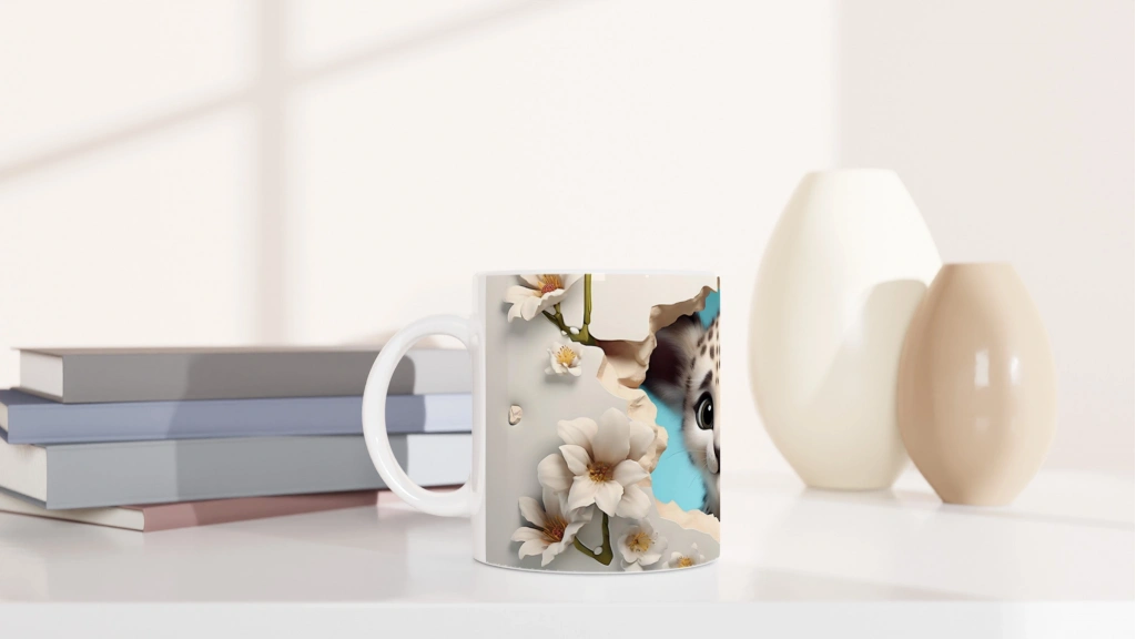 Baharın Masum Yüzü Kar Leoparı Yavrusu Temalı Baskılı Kupa Bardak, zarif çiçeklerle çevrili çatlak duvardan başını uzatan tatlı bakışlı yavruyla içeceğinize sıcaklık katıyor. Doğaya ve sevimli dostlara hayran herkes için ideal bir hediye!