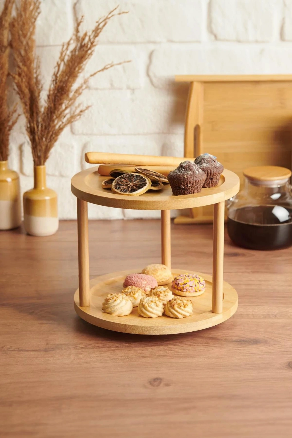 Ürün Hikayesi: Doğal bambudan üretilmiş iki katlı döner sunumluk, sofralarınıza hem şıklık hem de pratiklik katar. Atıştırmalık, tatlı ve meze sunumları için ideal bir seçenektir.