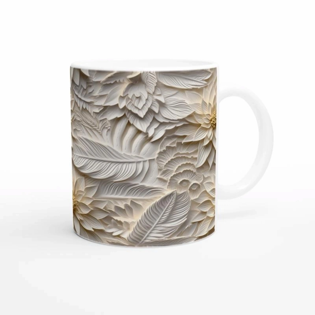 Bej Rölyef Çiçek ve Yaprak Desenli Kupa Bardak