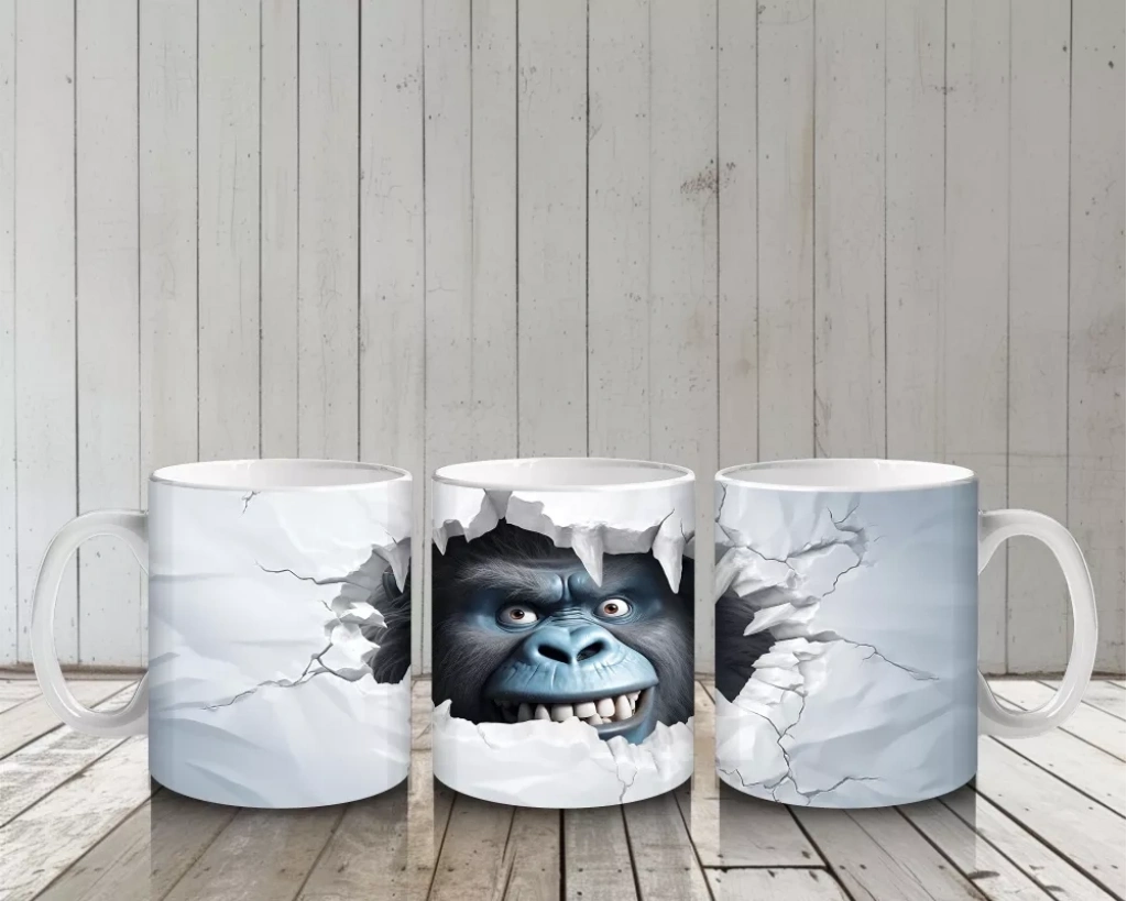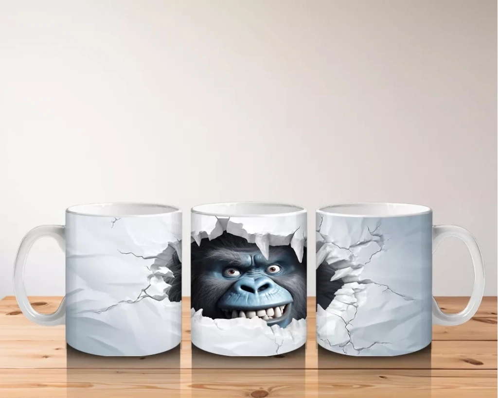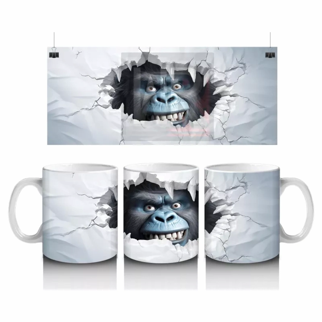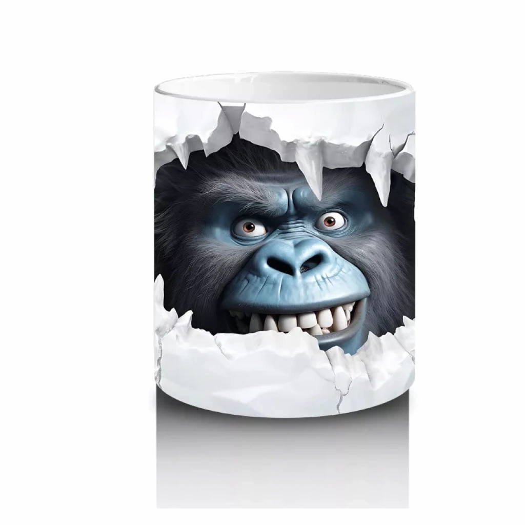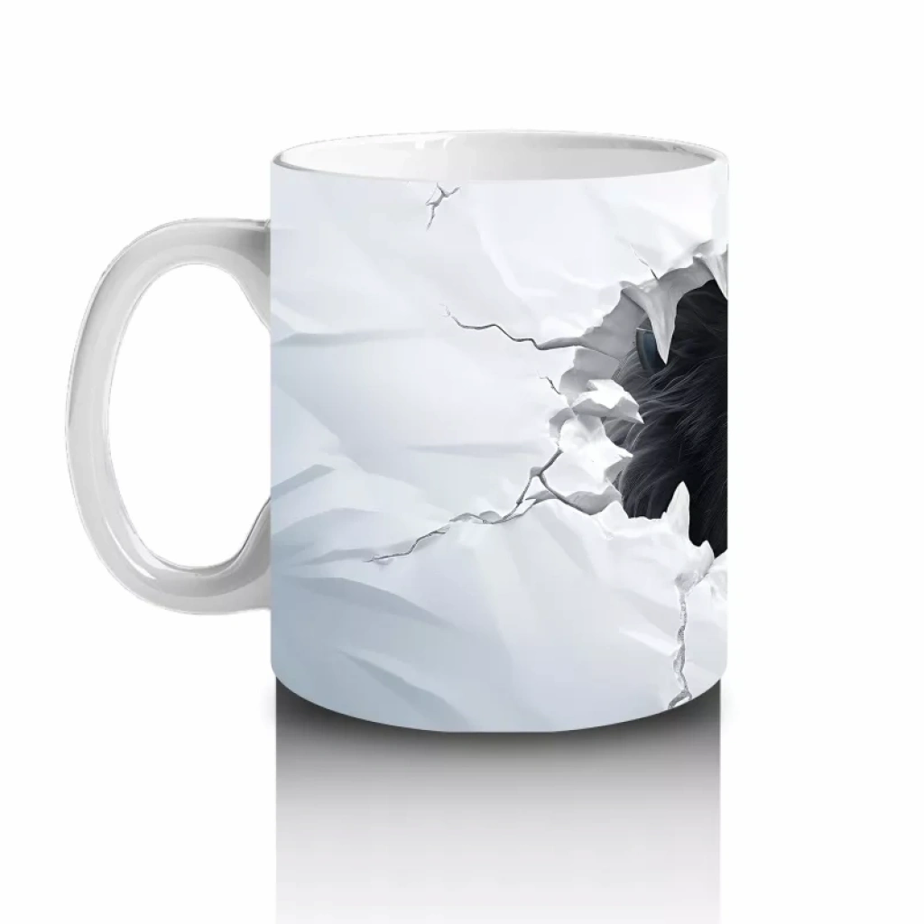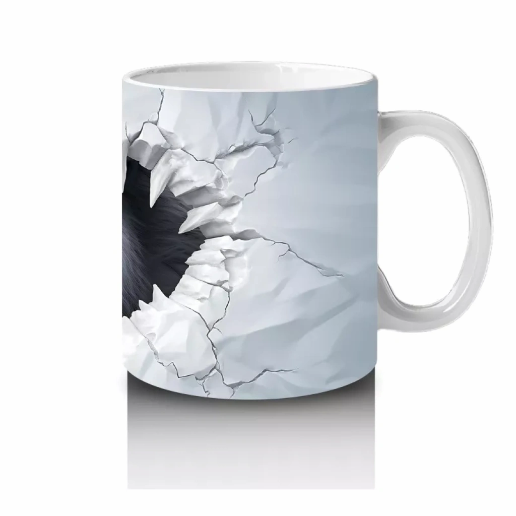 Beyaz çatlaklı duvarın arasından aniden beliren yırtıcı hayvan figürü, dramatik ve dikkat çekici bir etki yaratıyor. Sürprizli ve güçlü görselleri sevenler için dinamik bir kupa tasarımı.