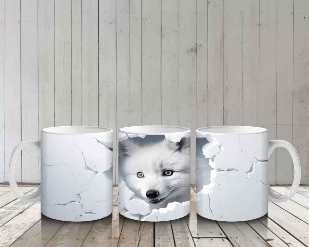 Beyaz çatlaklı zemin üzerinde dikkatle bakan tilki yavrusu, hem sevimliliği hem de zekasıyla göz dolduruyor. Sade ama etkileyici sahneleri sevenler için zarif bir kupa tasarımı.