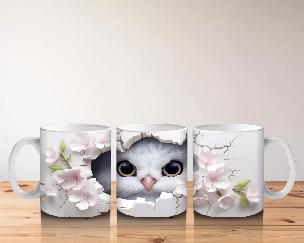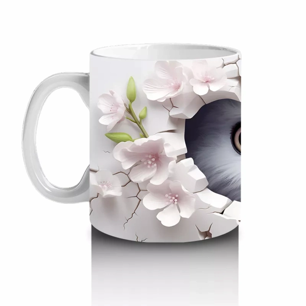 Beyaz Çiçekler Arasında Bakan Sevimli Baykuş Yüzü – Baskılı Kahve Kupası