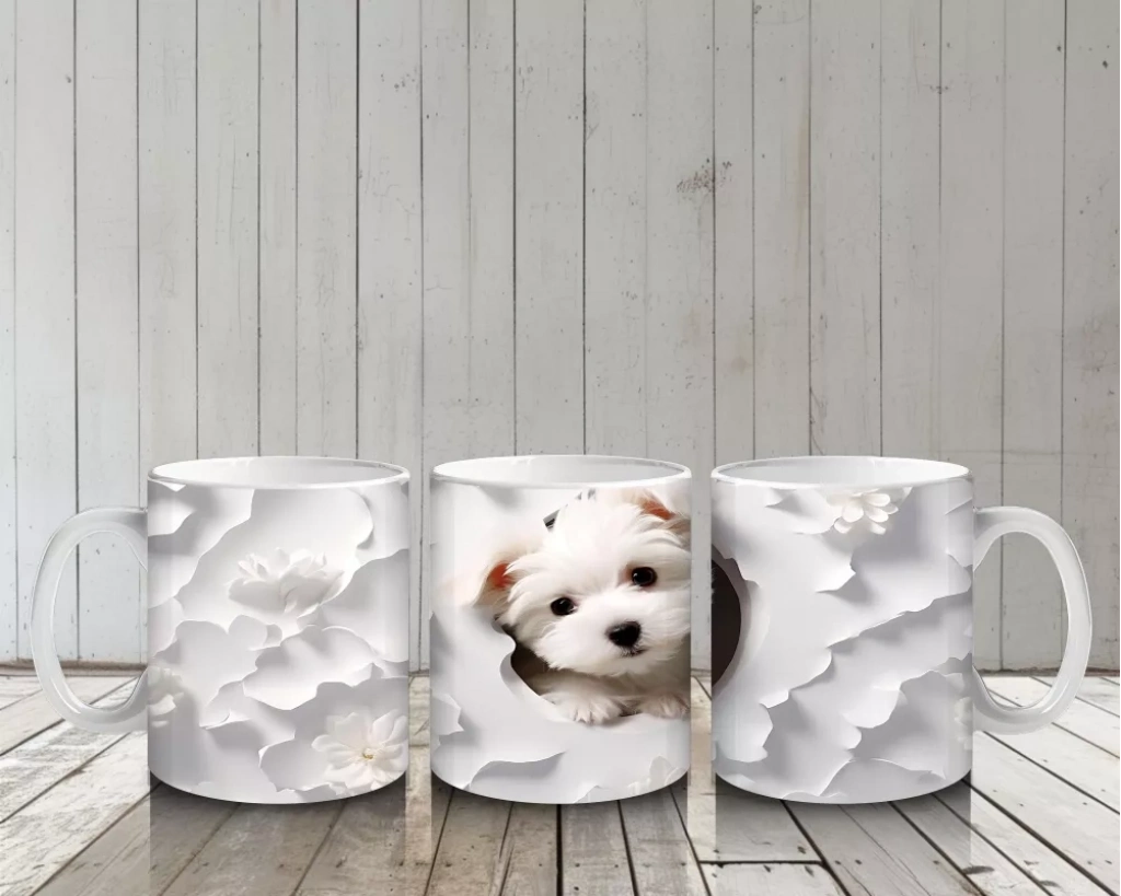 Beyaz Çiçekler Arasında Bakan Sevimli Köpek – Baskılı Kahve Kupası