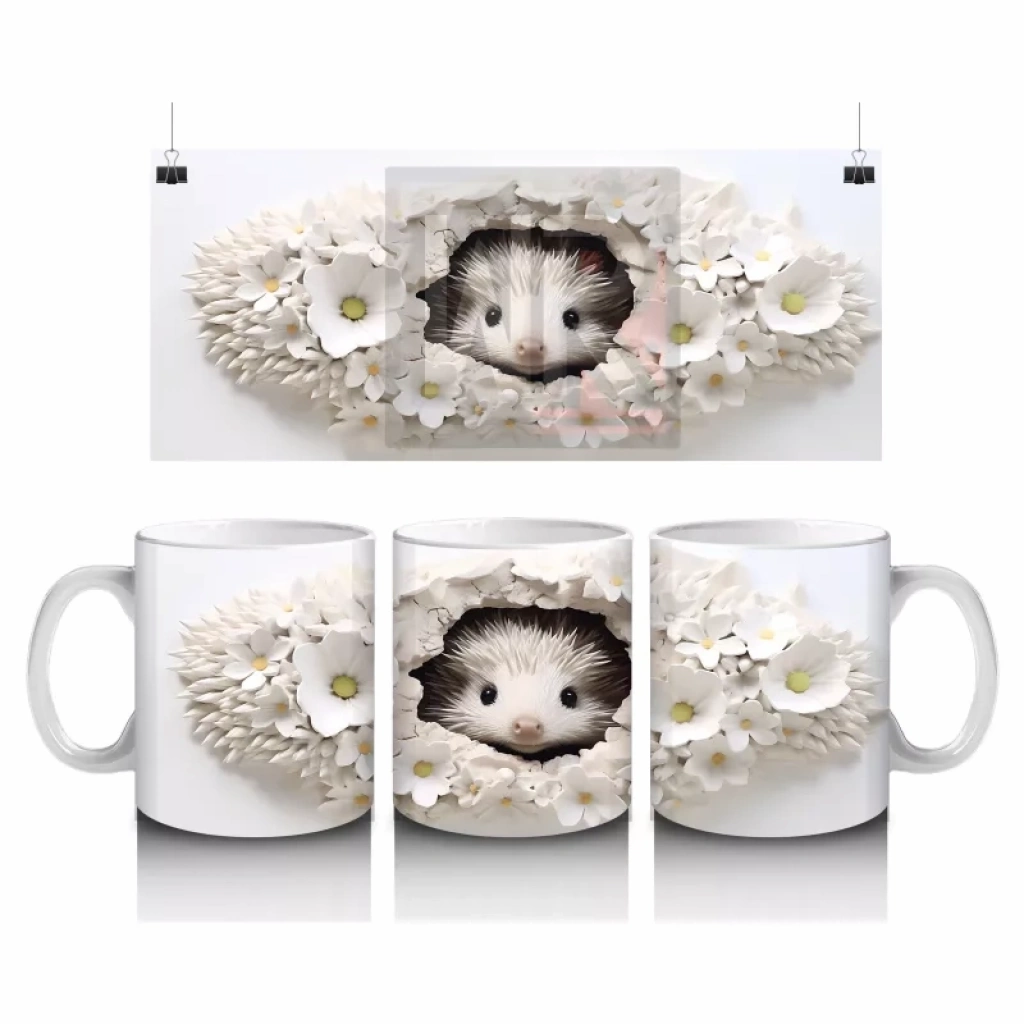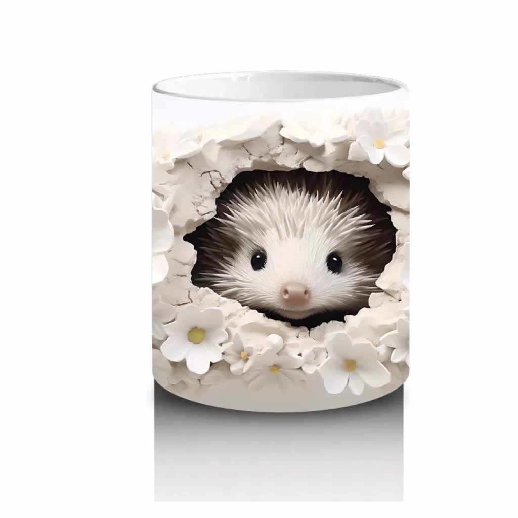 Beyaz çiçeklerin arasından meraklı bakışlarla sizi izleyen bu tatlı kirpi, doğanın sevimli yüzünü yansıtan bir tasarım sunuyor. Hayvanseverlere sıcak ve doğal bir kahve keyfi vadediyor.