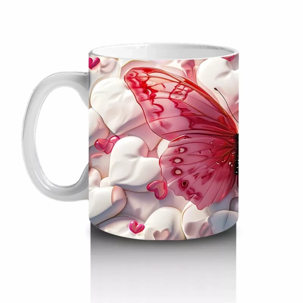 Beyaz çiçeklerin arasında zarifçe konumlanan pembe kelebek, doğanın yumuşak ve huzurlu yüzünü yansıtıyor. Bahar esintili, dingin bir kahve molası için harika bir kupa.