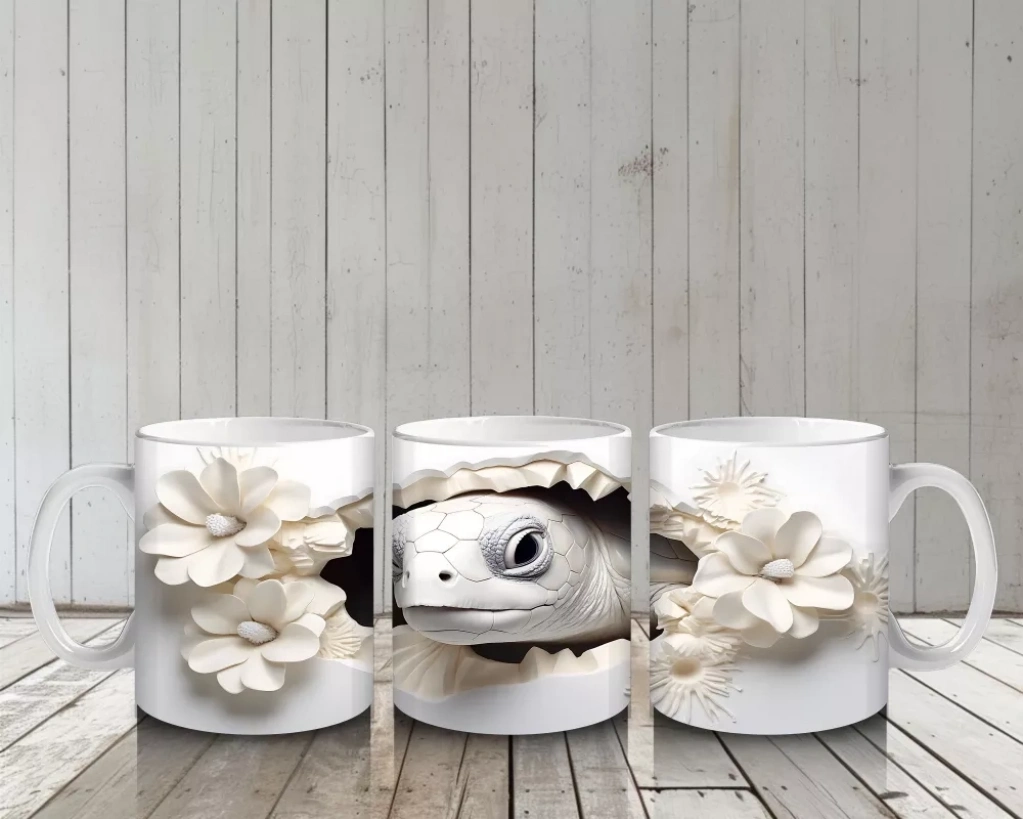 Beyaz Çiçekler Arasında Sevimli Kaplumbağa – Baskılı Kahve Kupası