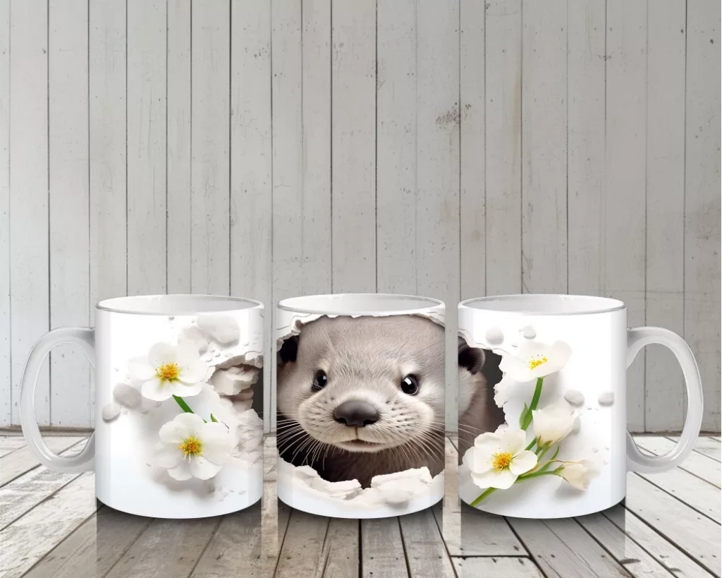 Beyaz çiçeklerin arasına saklanmış bu tatlı su samuru, sade ama etkileyici bir görüntü sunuyor. Masum ve içten tasarımları sevenler için yumuşak bir kupa alternatifi.