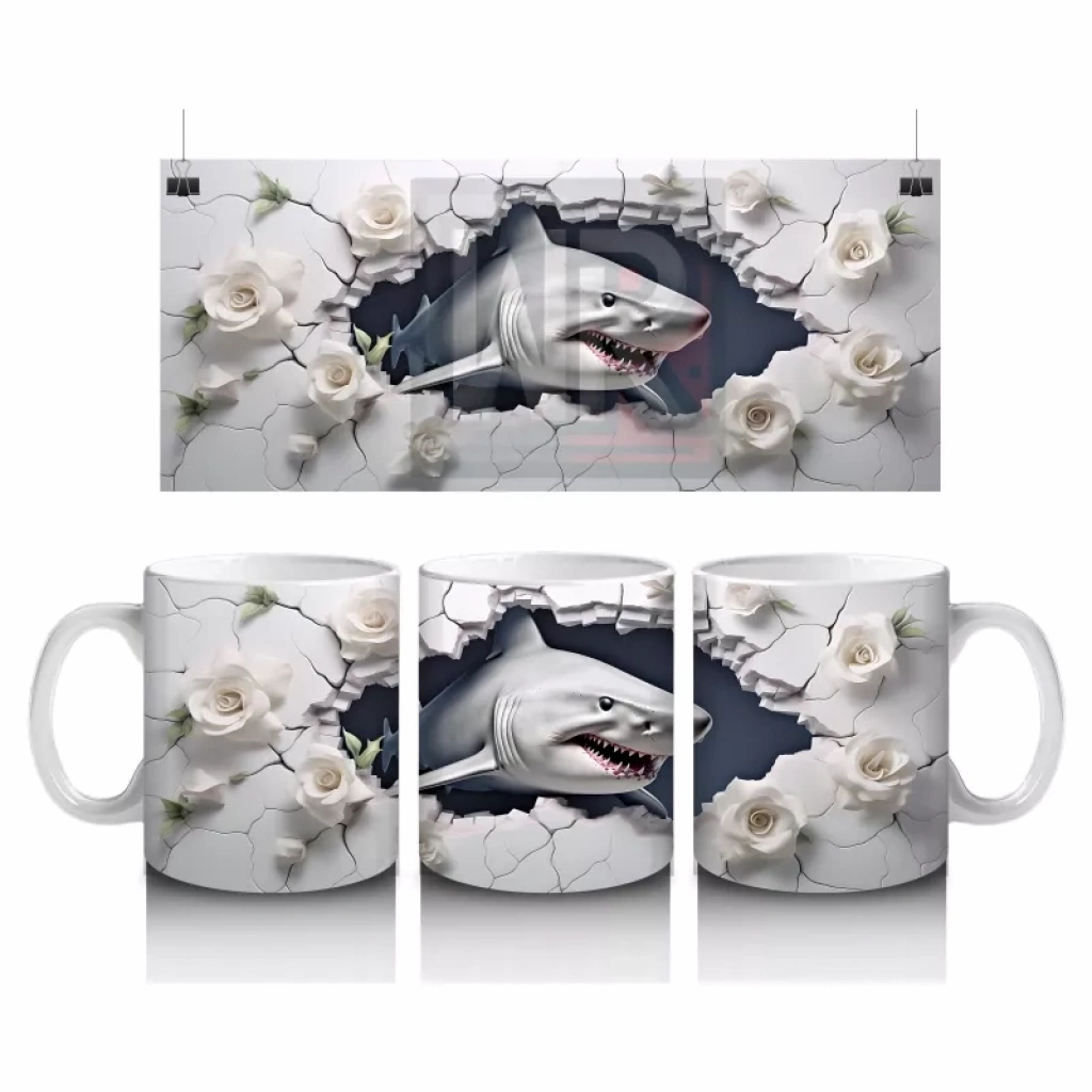 Beyaz çiçeklerle bezenmiş çatlak zeminden bakan köpekbalığı, masumiyet ve güç temalarını harmanlıyor. Zarif ve etkileyici detaylar arayanlar için özel bir kupa.