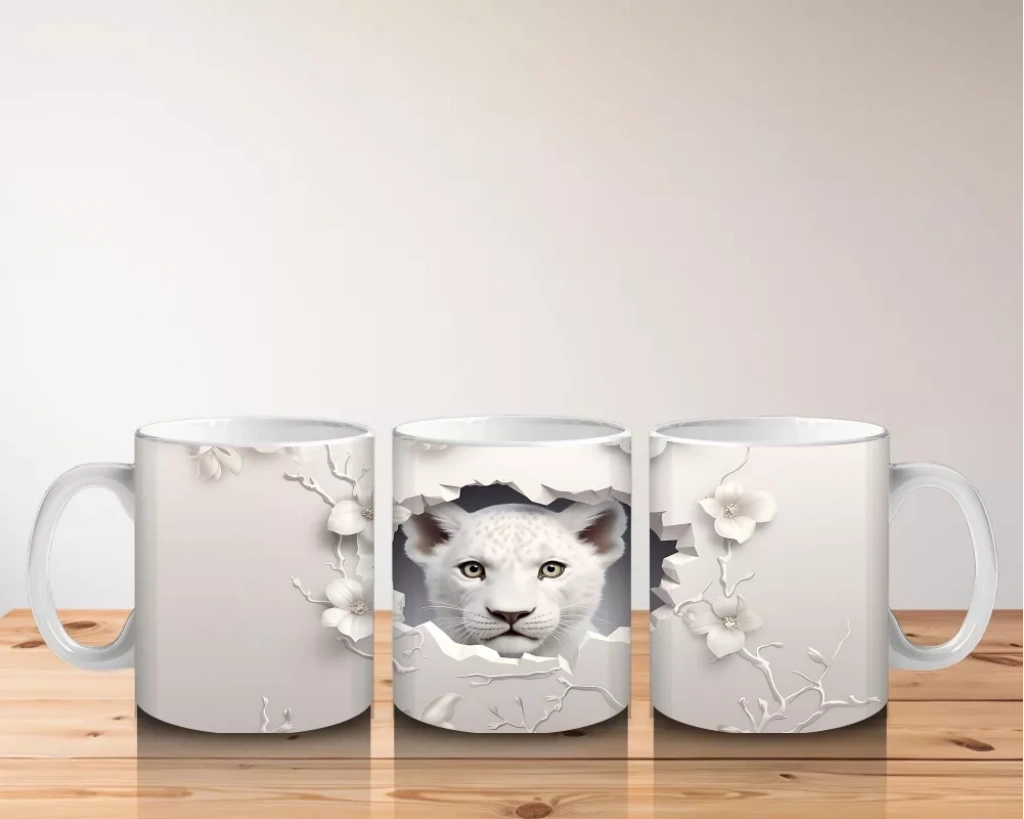 Beyaz çiçeklerle süslenmiş çatlak yüzeyin ardından bakan sevimli kaplan, vahşi doğanın minnoş hâlini yansıtıyor. Güç ve şirinliği bir arada sunan bu tasarım, dikkat çekici bir hediye seçeneği.