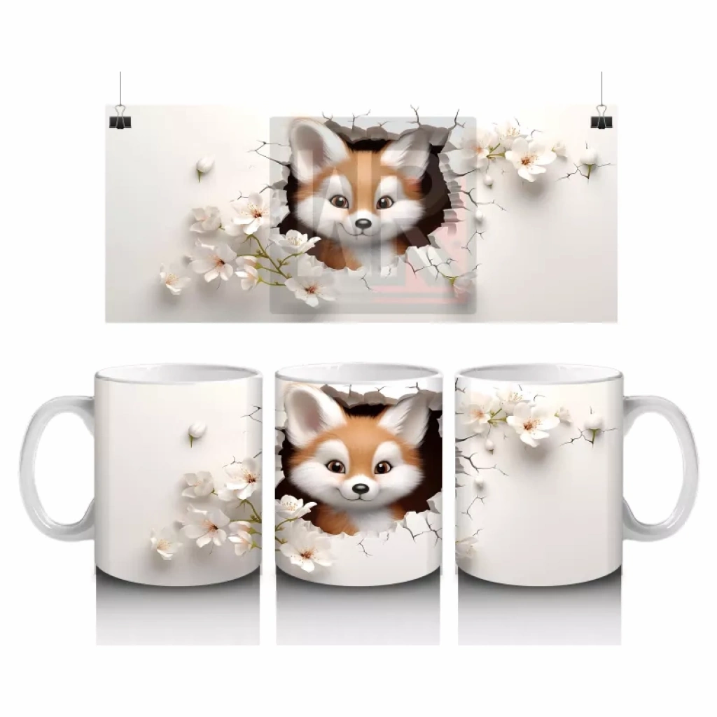 Beyaz Çiçekli Fon Üzerinde Sevimli Tilki – Baskılı Kahve Kupası