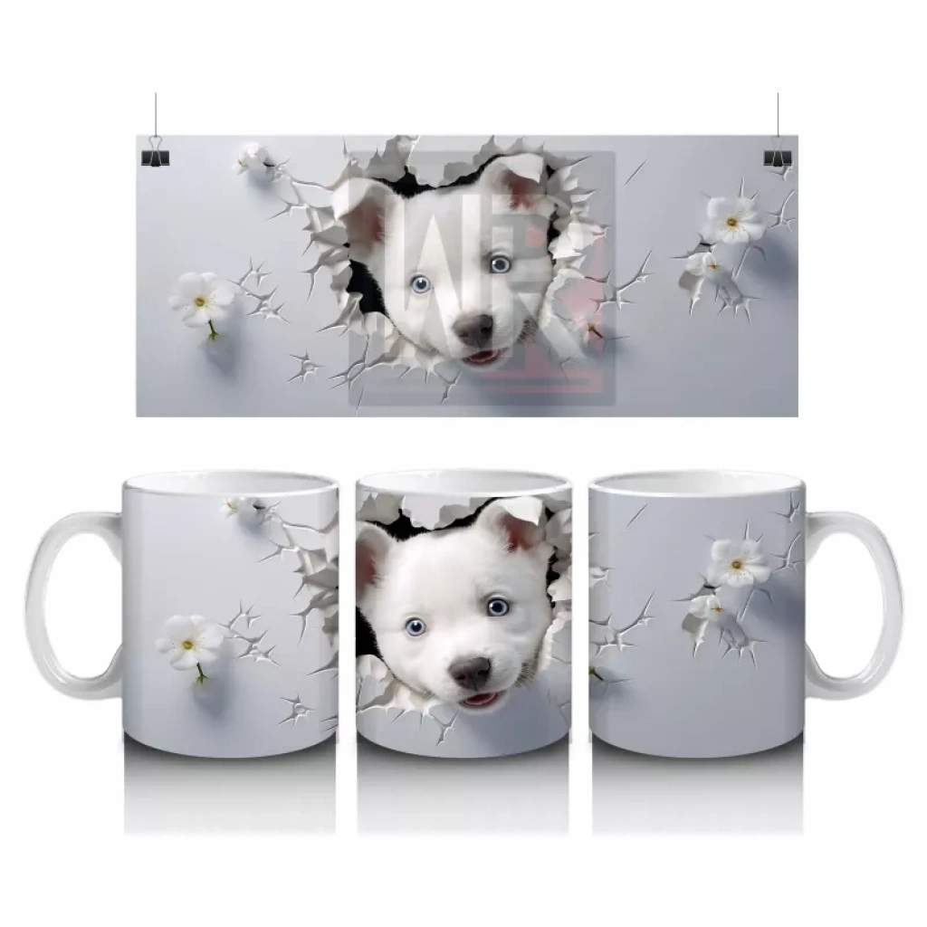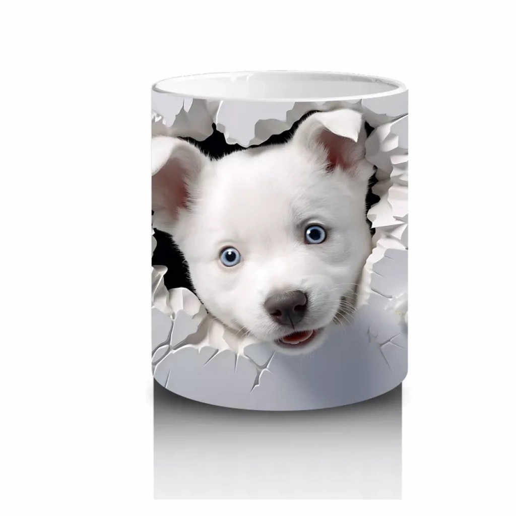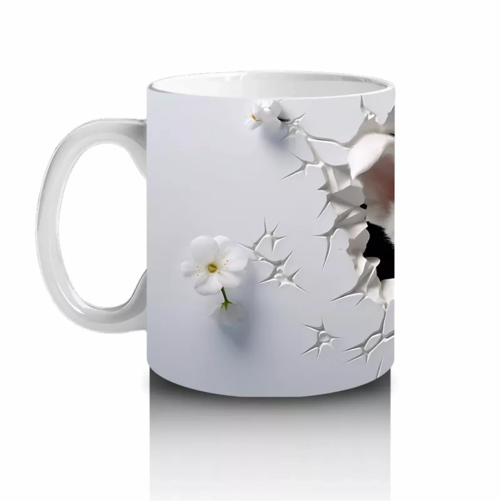 Beyaz çiçekli sade arka plan önünde duran bu sevimli yavru, masumiyetiyle kalpleri ısıtıyor. Minimal ama etkileyici tasarımlardan hoşlananlara özel, huzur veren bir kupa.