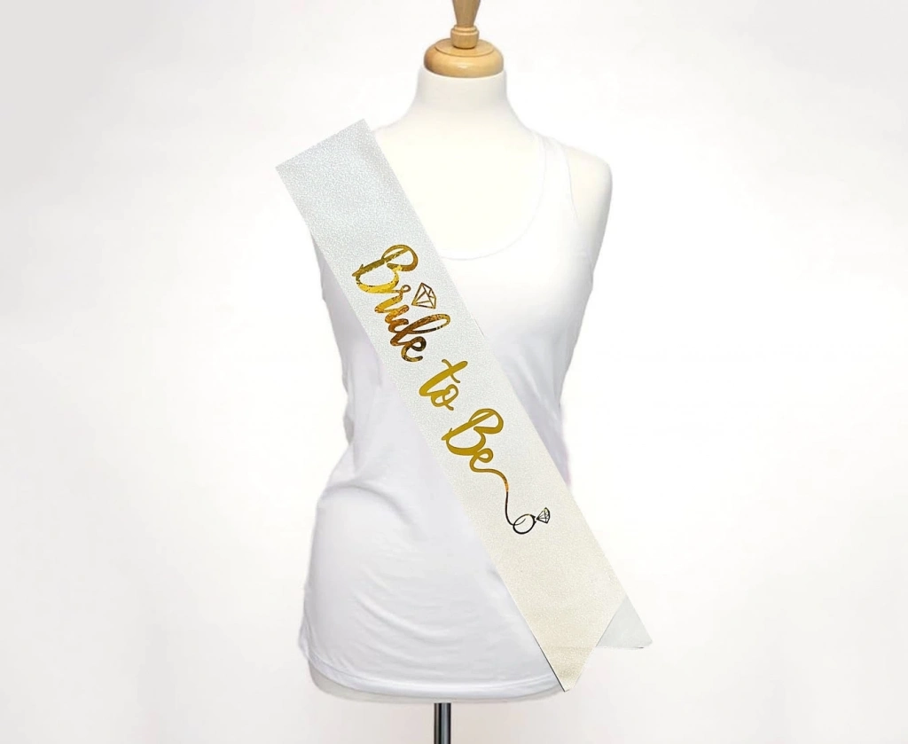 Beyaz Üzeri Altın İtalik Alyanslı Bride To Be Yazılı Simli Işıltılı Kuşak Kemer 10x80 cm