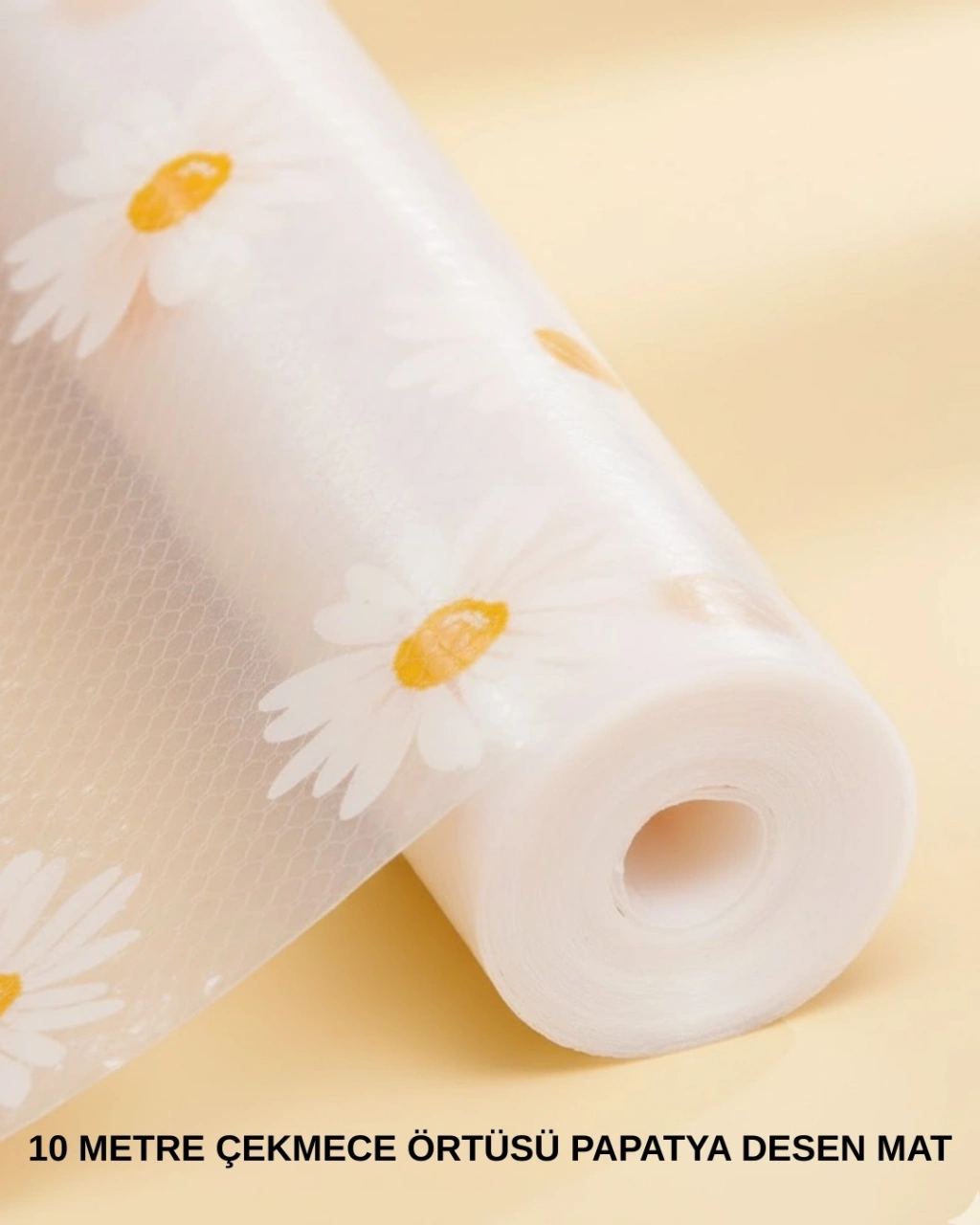 Çekmece ve dolap içlerinde düzeni sağlamak, yüzeyleri korumak ve eşyalarınızı güvenle saklamak için tasarlanan bu papatya desenli kaymaz çekmece içi mat, pratik kullanımı ve dekoratif görünümüyle öne çıkar. Ürün 10 metre uzunluğa sahiptir ve tek parça halinde gönderilir. Bu uzunluk sayesinde geniş çekmecelerde kesintisiz kullanım sağlar; aynı zamanda ihtiyaca göre kesilerek birden fazla çekmecede rahatlıkla kullanılabilir.Papatya desenli tasarımı, sade ve ferah bir görünüm sunarak mutfak, banyo ve yaşam alanlarına estetik bir dokunuş katar. Şeffaf yapısı sayesinde çekmece içindeki eşyalar kolayca görülebilir. Kaşık, çatal, mutfak gereçleri, kozmetik ürünleri, takılar ve kırtasiye malzemeleri için ideal bir düzenleme çözümüdür.Kaymaz yüzeyi sayesinde çekmece açılıp kapatıldığında mat yerinden oynamaz, eşyalar sabit kalır. Yapışkan içermeyen yapısı, yüzeylerde iz veya kalıntı bırakmaz. Kullanım sonrası kolayca çıkarılıp tekrar yerleştirilebilir.Kolay temizlenebilir özelliği sayesinde hijyenik kullanım sunar. Yağ ve lekeler nemli bez veya süngerle zahmetsizce silinebilir. 10 metrelik uzunluğu, mutfak, banyo, ofis ve makyaj masası çekmecelerinde tek ürünle çoklu kullanım avantajı sağlar. Hem düzen hem de yüzey koruması arayanlar için pratik ve estetik bir çözümdür.