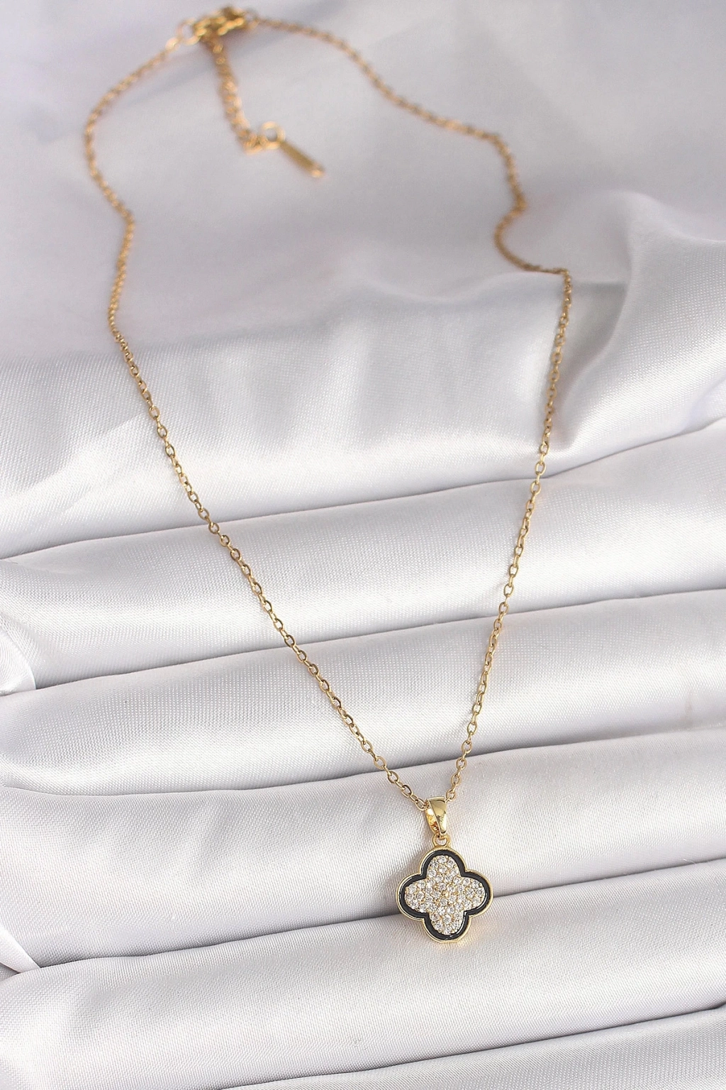 BFS 316L Çelik Gold Renk Zincir Zirkon Taşlı Yonca Model Kadın Kolye
