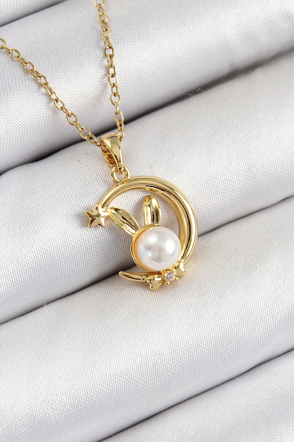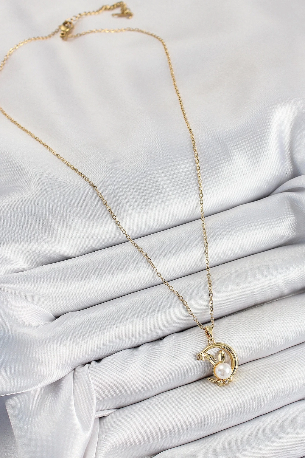 BFS 316L Çelik İnci Detaylı Hilal Tavşan Model Gold Renk Kadın Kolye