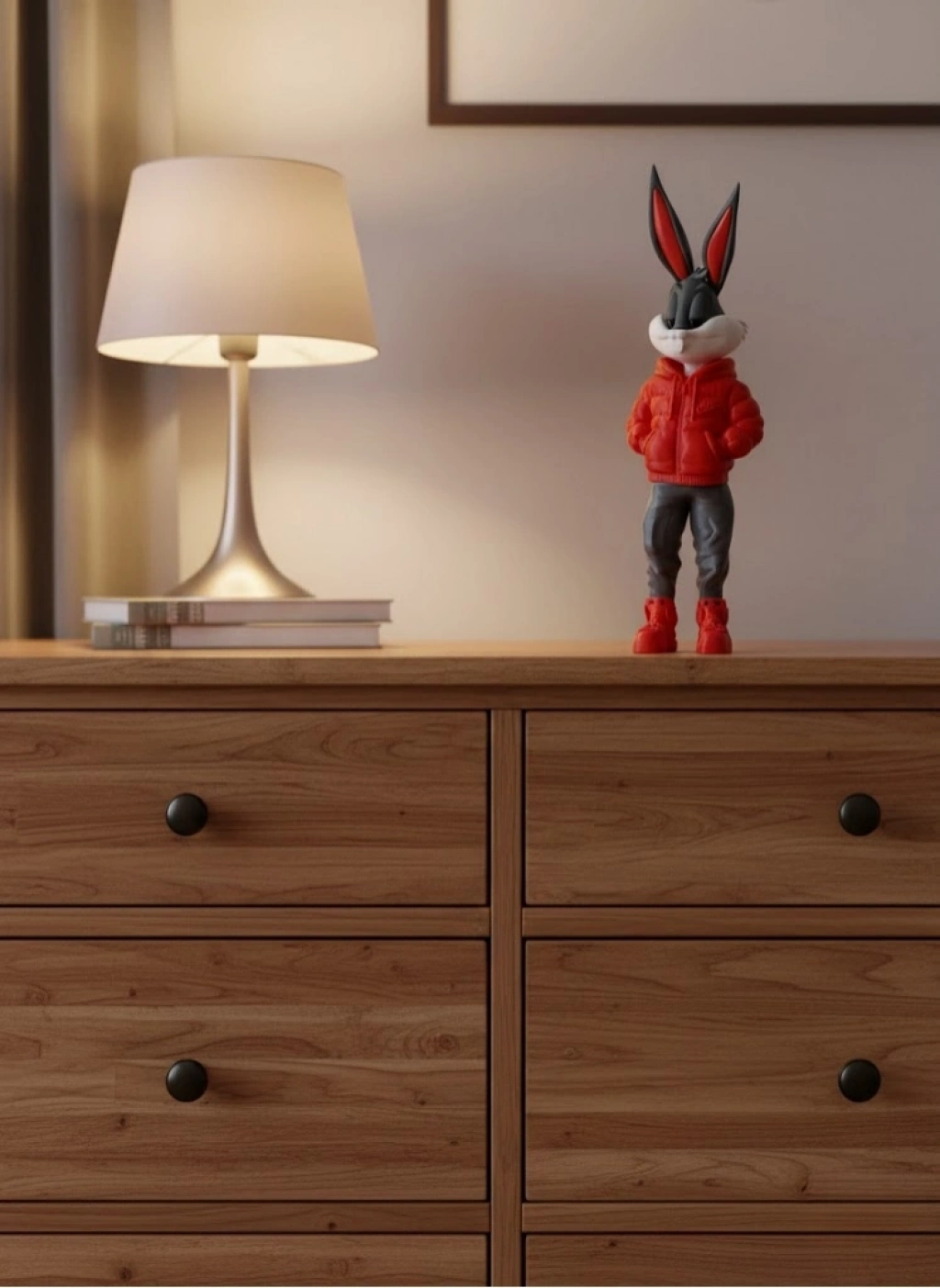 10×34 cm ölçülerindeki Bugs Bunny figürü, büyük boy tasarımıyla bulunduğu ortamda dikkat çekici bir dekoratif parça olarak öne çıkar. Modern kıyafet detayları ve ayakta duruşu sayesinde salon, genç odası veya çalışma alanlarında güçlü bir görsel etki yaratır. Raf, konsol ve masa üstü kullanımlar için idealdir.