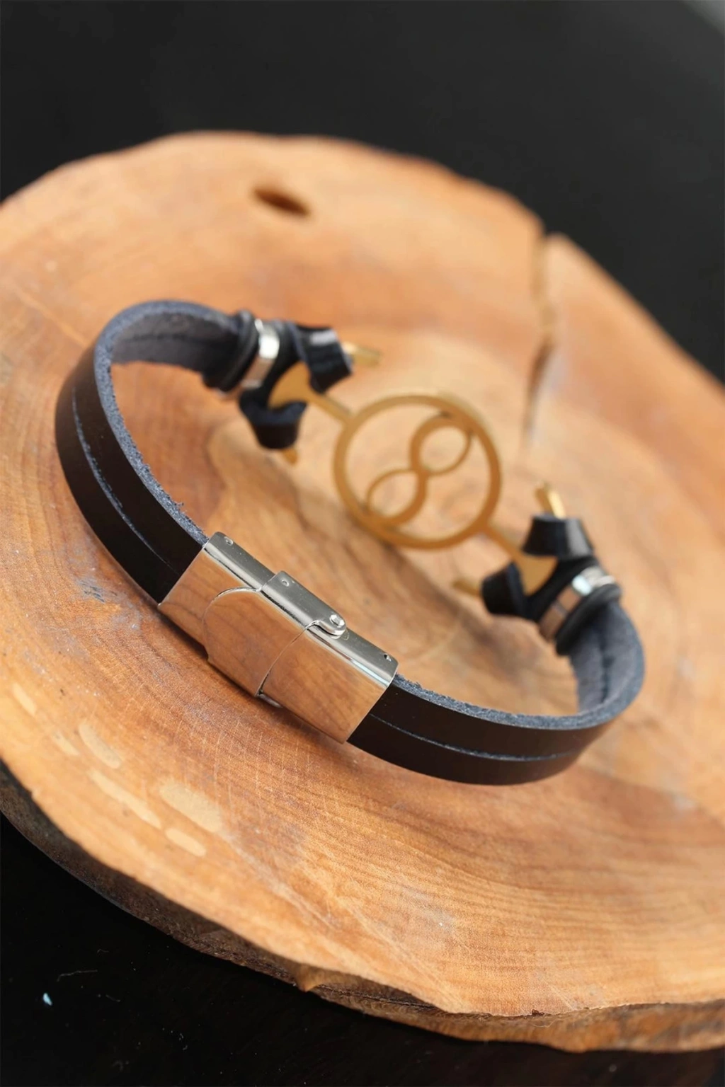 Sezona Gold Renk Sonsuzluklu Metal Aksesuarlı Siyah Renk Deri Erkek Bileklik ile damga vurun.