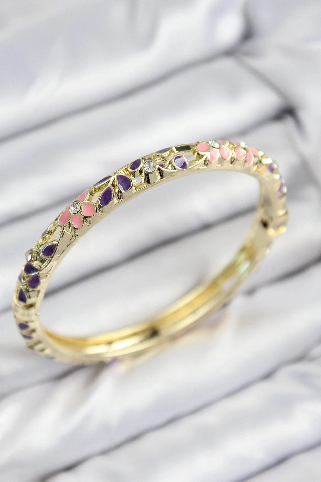 Bfs Mineli Pirinç Zirkon Taşlı Pembe Mor Çiçek Motifli Gold Kadın Kelepçe