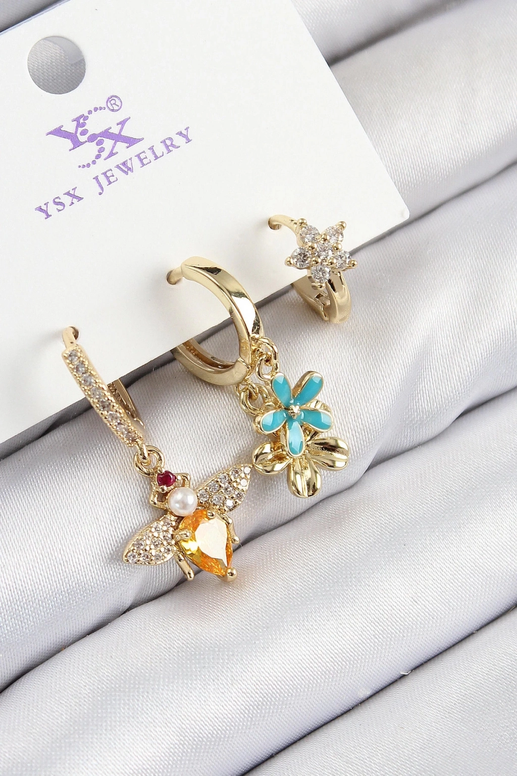 BFS Pirinç Zirkon Taşlı 3'lü Arı Ve Çiçek Model Gold Renk Kadın Küpe