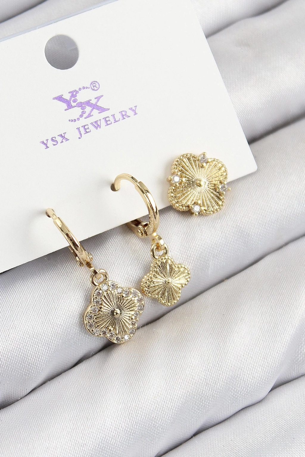 BFS Pirinç Zirkon Taşlı 3'lü Yonca Model Gold Renk Kadın Küpe
