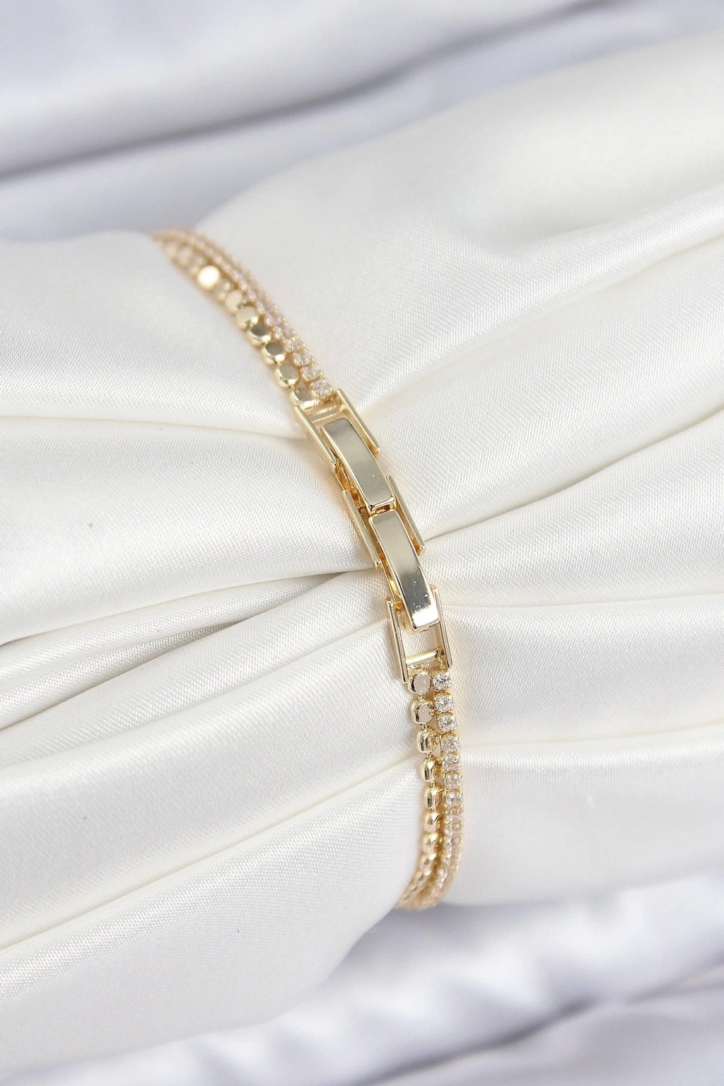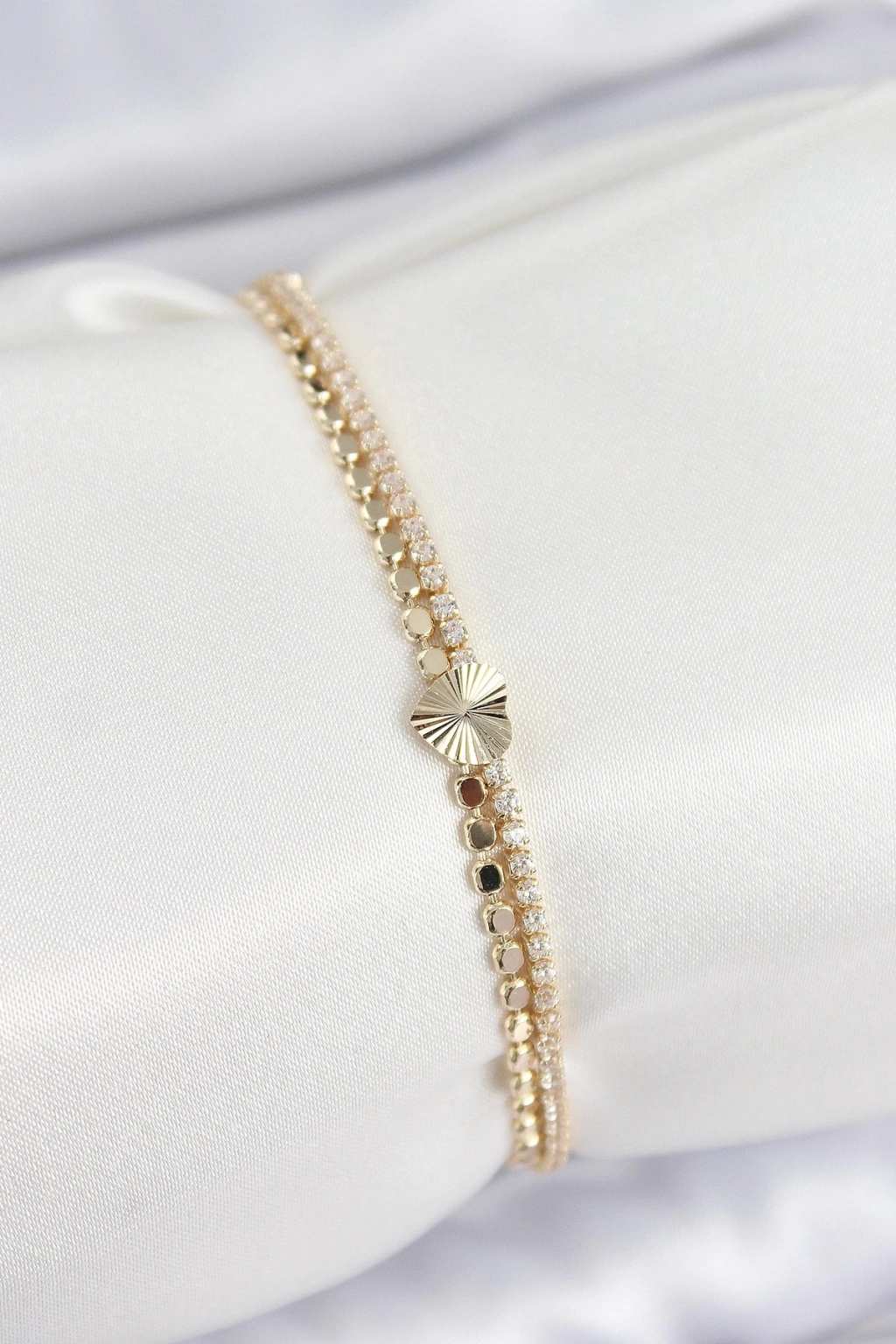 BFS Pirinç Zirkon Taşlı Ezme Zincirli Kalp Model Gold Renk Kadın Bilekilk