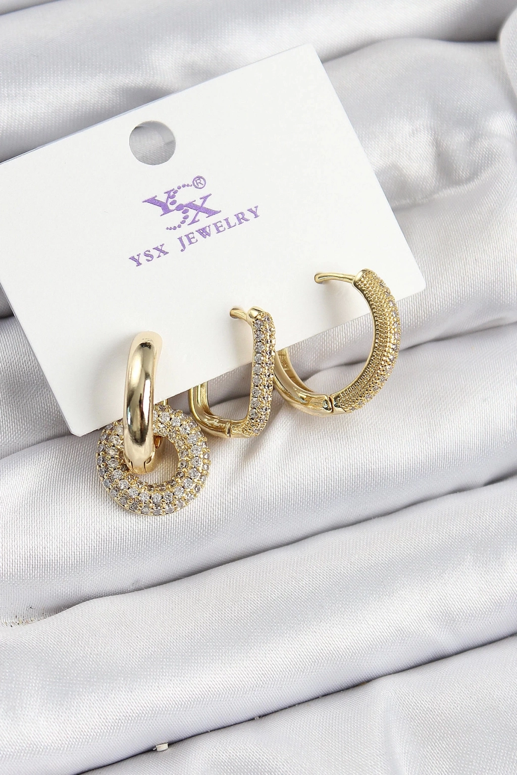 BFS Pirinç Zİrkon Taşlı Halka Model Gold Renk 3'lü Kadın Küpe