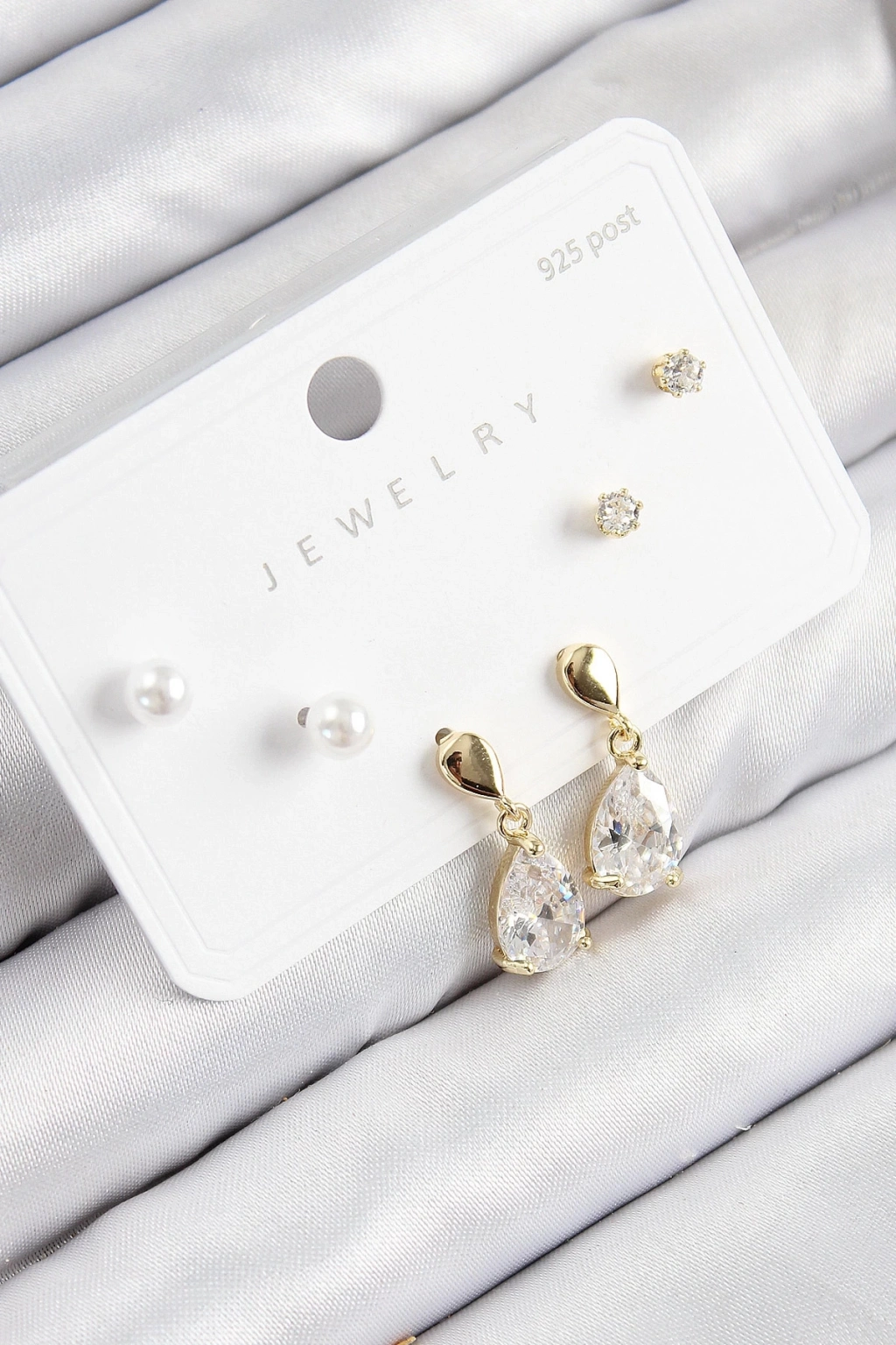 BFS Pirinç Zirkon Taşlı Sallantılı Damla Model Gold Renk 925 Ayar Gümüş Çivi Kadın Küpe Set