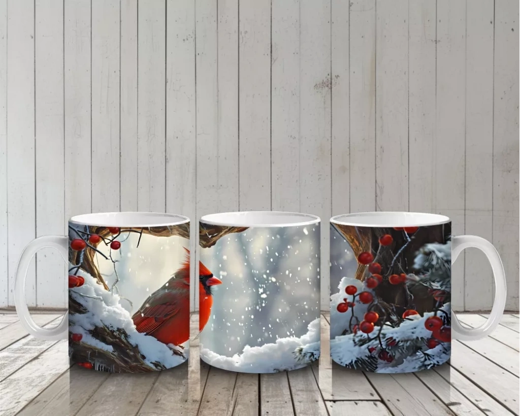 Buzla kaplı dallar üzerinde duran kardinal kuşu, soğuk kış atmosferinde canlı ve parlak bir renk kontrastı sunuyor. Doğa ve kış temalı zarif bir kupa tasarımı.