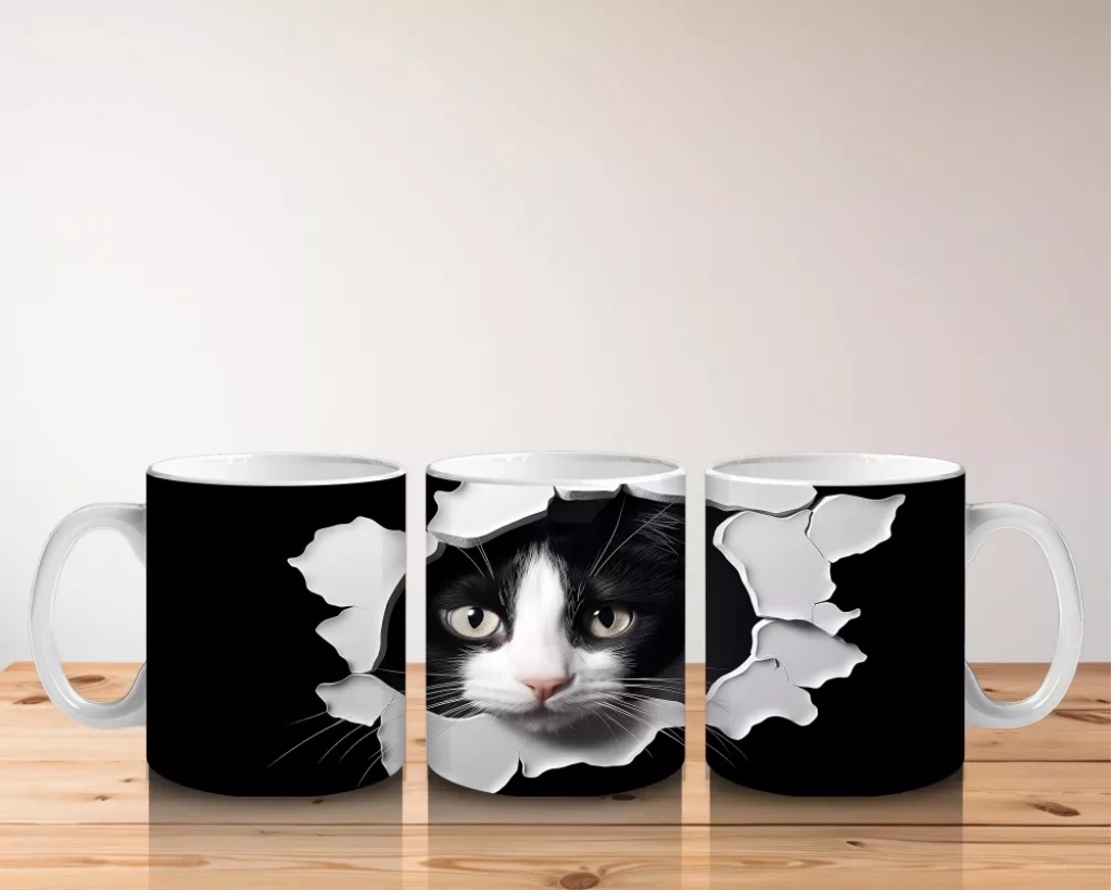 Çatlamış duvarın ardından dikkatle bakan siyah beyaz kedi, hem meraklı hem de sevimli bir izlenim bırakıyor. Sade ama etkileyici sahneleri sevenler için hoş bir kupa tasarımı.