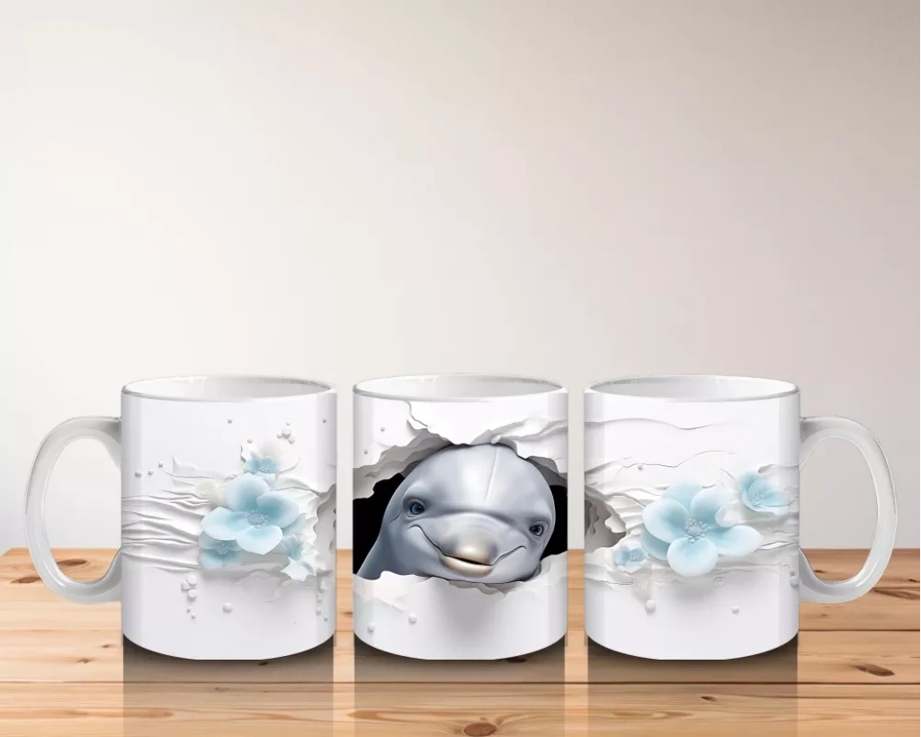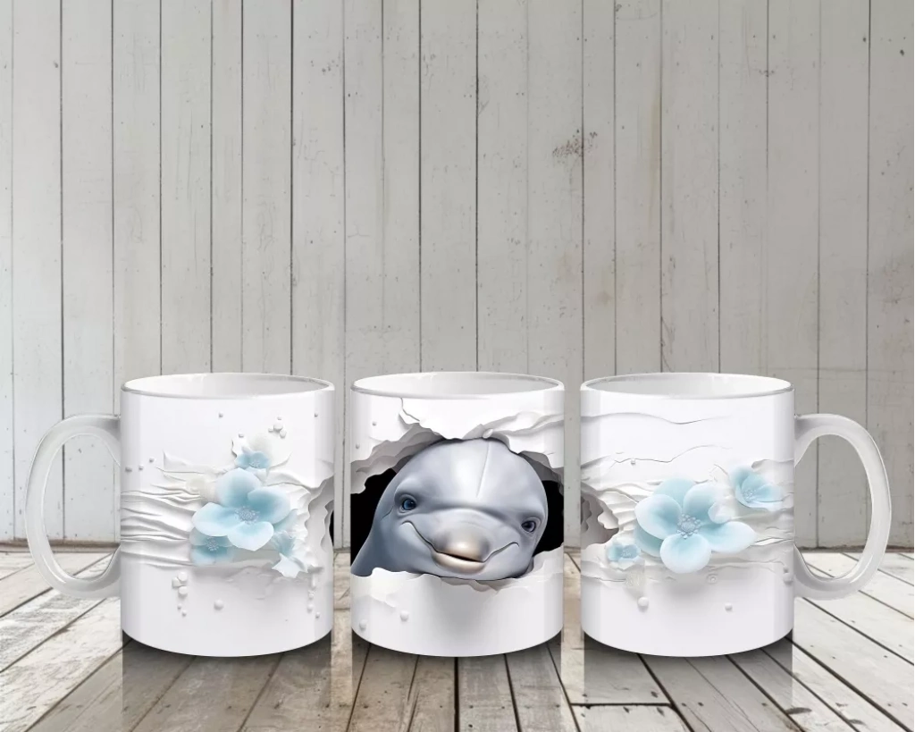Çatlak duvarın içinden enerjik bir şekilde çıkan yunus figürü, sürprizli ve neşeli bir sahne yaratıyor. Deniz temasını sevenler için hem eğlenceli hem dinamik bir kupa tasarımı.