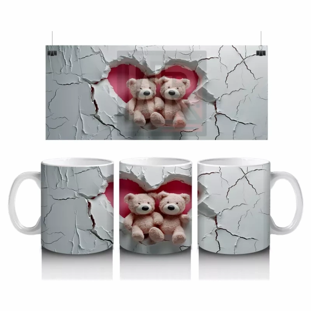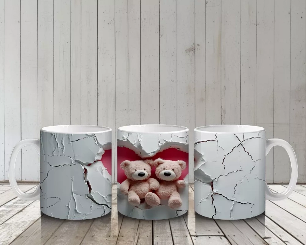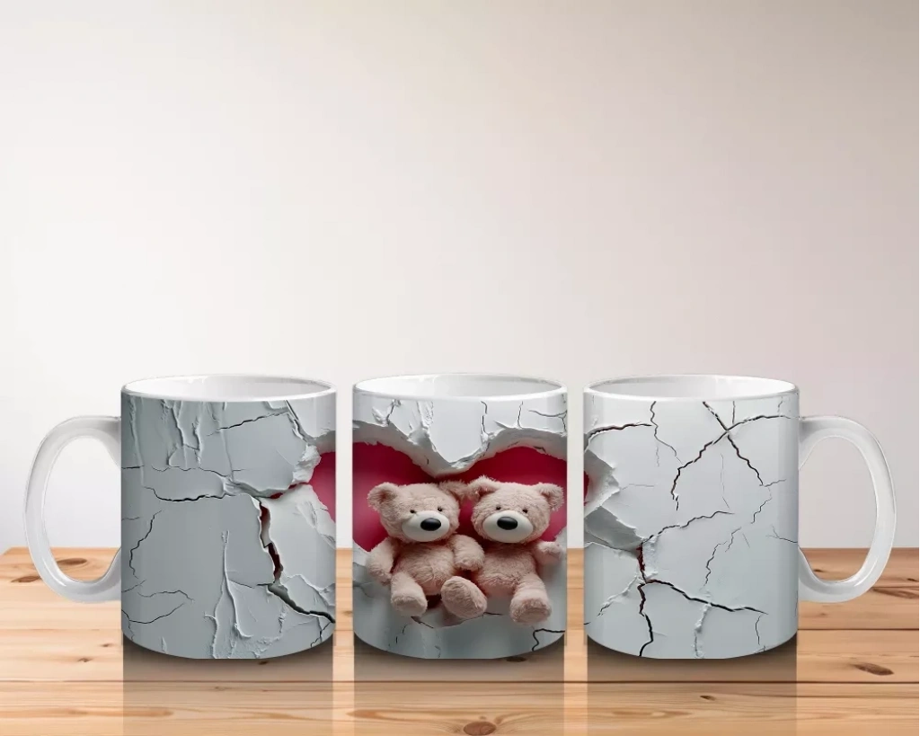 Sevimli peluş ayı kardeşler, çatlak duvar önündeki kompozisyonla nostaljik ve eğlenceli bir hava sunuyor. Her yudumda çocukluk anılarınızı canlandıracak sıcak bir tasarım.