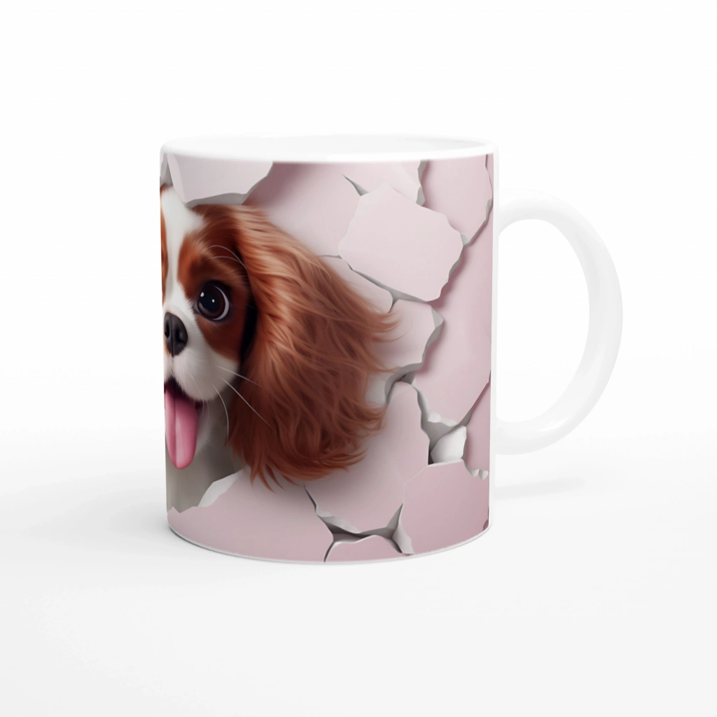 Çatlak Duvardan Bakan Cavalier King Charles Temalı Baskılı Kupa Bardak, pembe tonlardaki duvar efektiyle birleşerek sevimli dostunuzu her yudumda yanınızda hissettirir. Tatlı dili dışarıda pozuyla sıcaklık ve sadakat mesajı taşır.