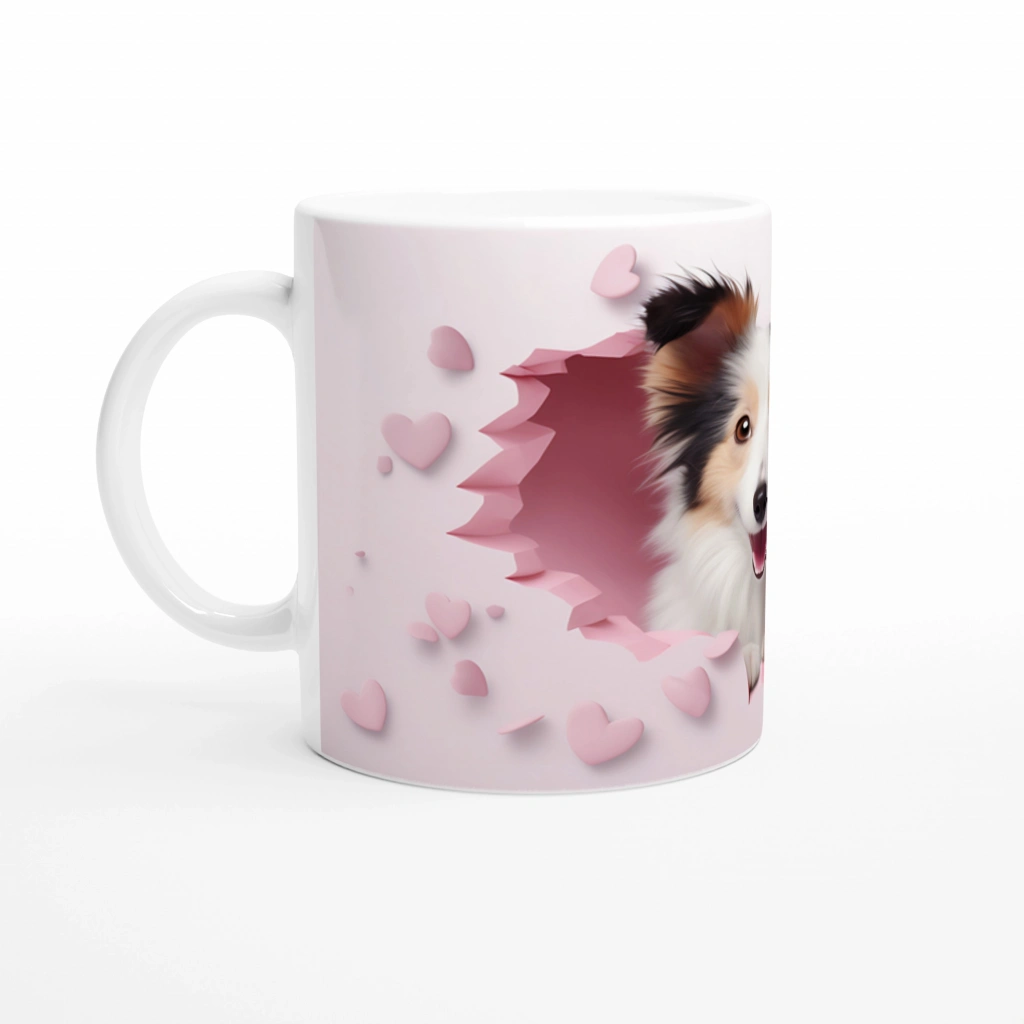 Çatlak Duvardan Bakan Sheltie Temalı Baskılı Kupa Bardak, pembe kalplerle çevrili çatlak duvar efekti ve enerjik bakışlı Sheltie köpeğiyle her içeceği sevgiyle buluşturur. Gülümseten detaylar arayanlar için mükemmel bir hediye seçeneği.
