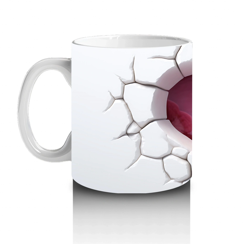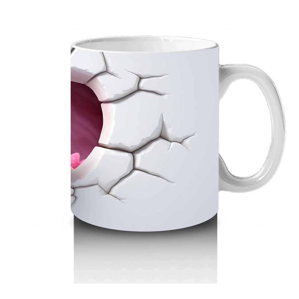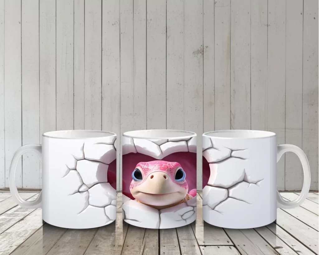Kalp şeklindeki çatlağın içinden sevimli gözlerle bakan kaplumbağa maskot, sade ama etkileyici bir tasarım sunuyor. Sevimli detaylarla dolu, duygusal ve neşeli bir kupa seçeneği.