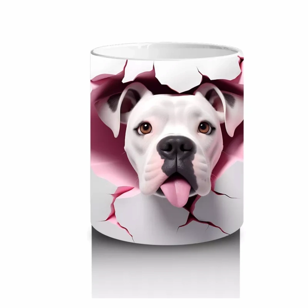 Çatlak pembe zeminden meraklı gözlerle bakan sevimli beyaz köpek, içten ve sıcak bir atmosfer yaratıyor. Sevimlilik ve neşe dolu tasarımlar arayanlar için özel bir tasarım.